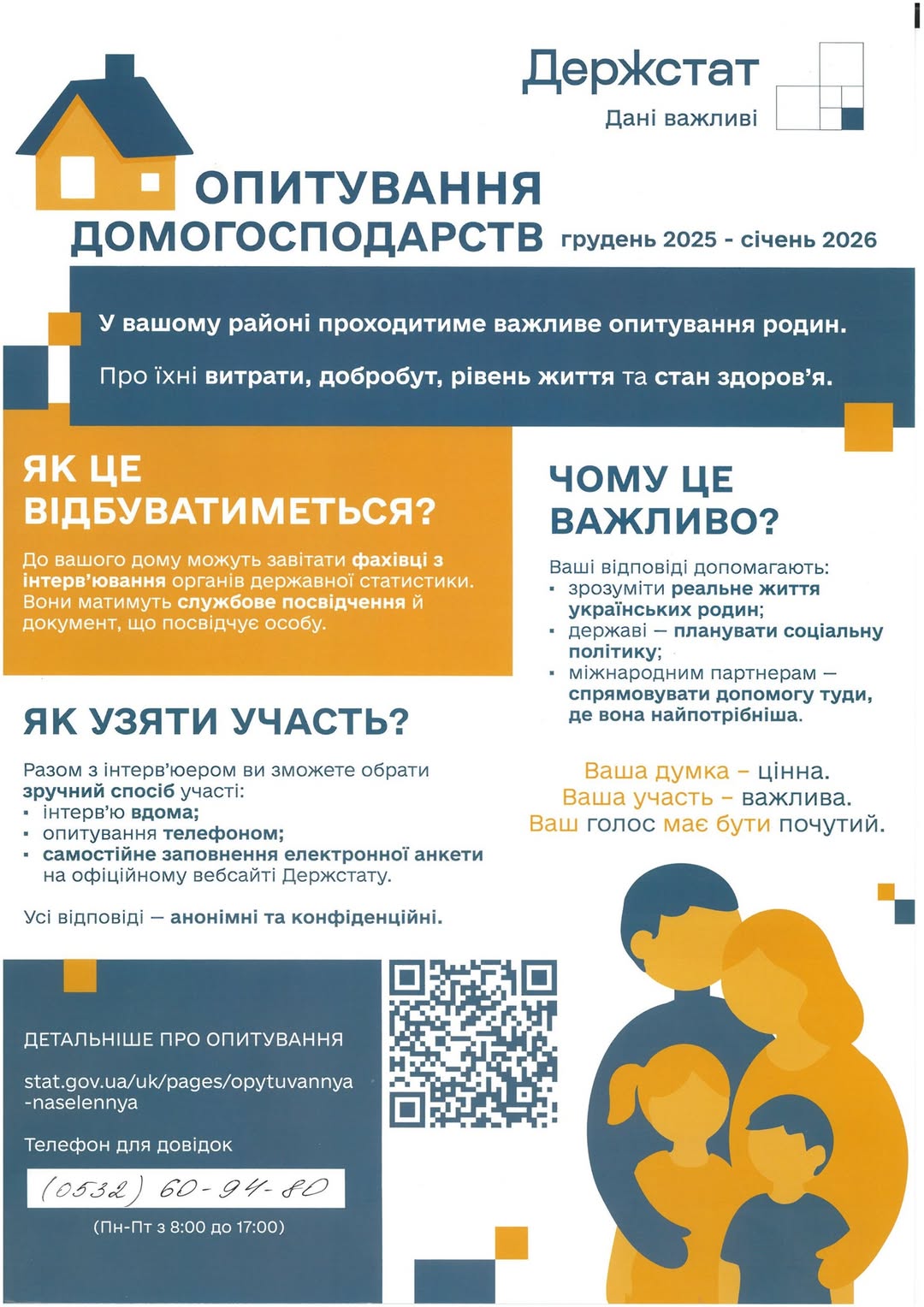 Головне управління статистики у Полтавській області інформує, що Державна служба статистики України відновлює проведення опитувань домогосподарств. З лютого 2022 року вибіркові обстеження населення (домогосподарств) не проводилися відповідно до Закону України “Про захист інтересів суб’єктів подання звітності та інших документів у період дії воєнного стану або стану війни”.