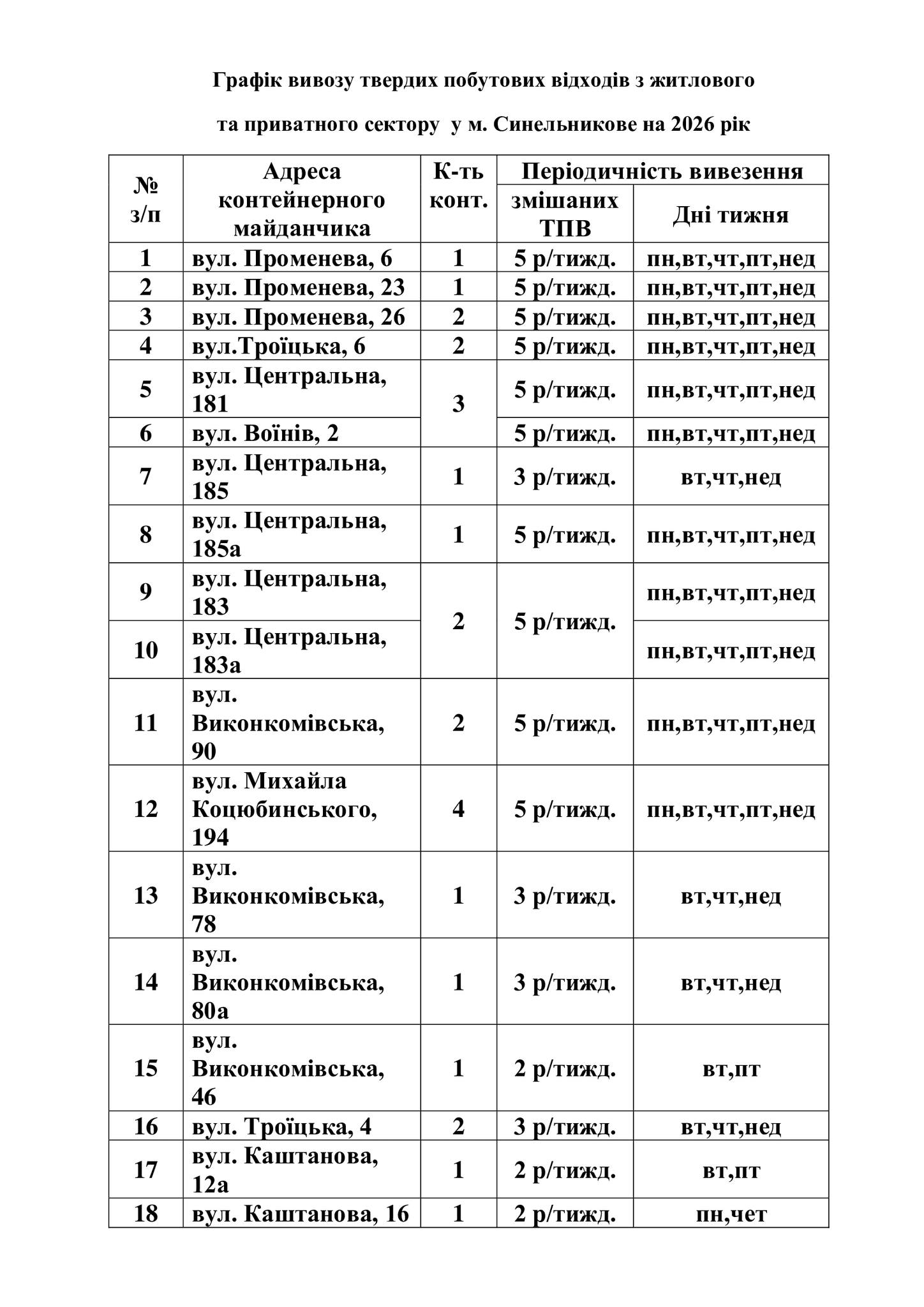 Графік вивозу твердих побутових відходів з житлового та приватного сектору у м. Синельникове на 2026 рік 📌