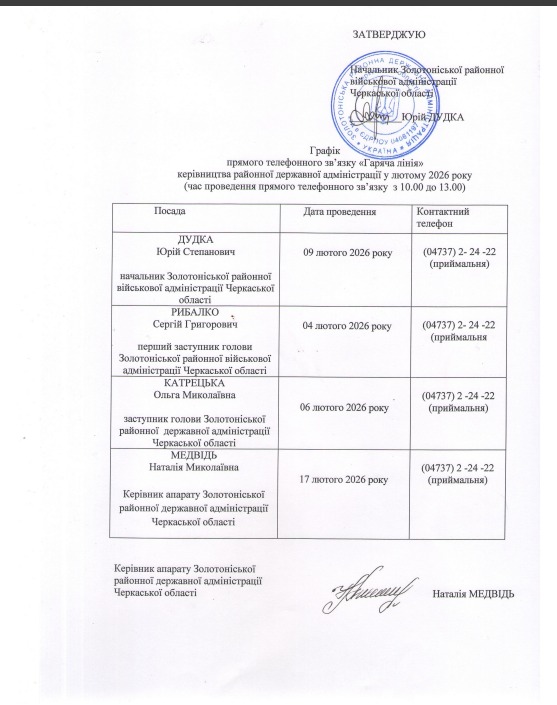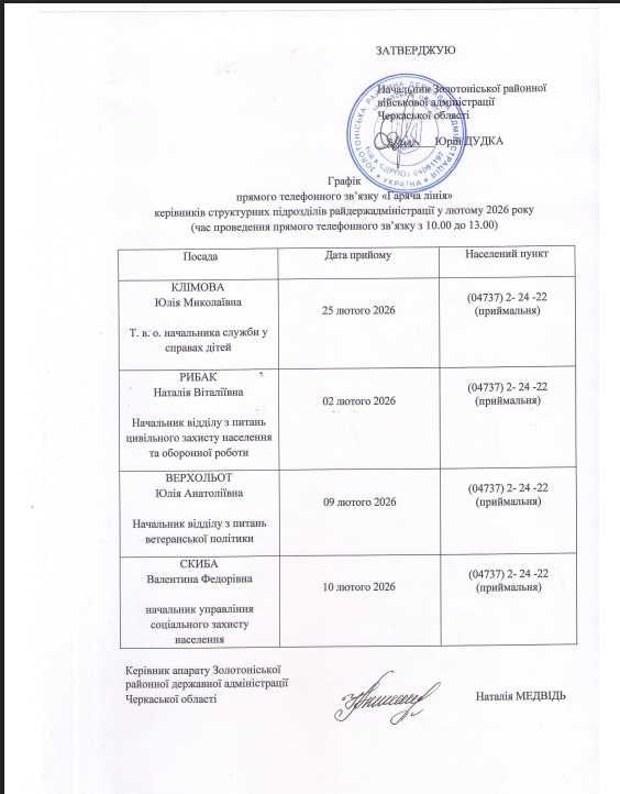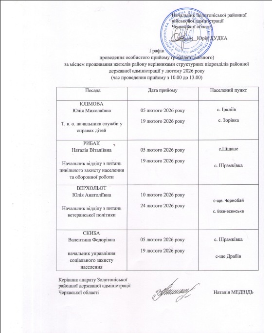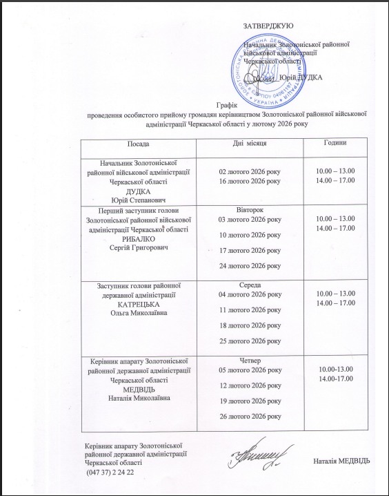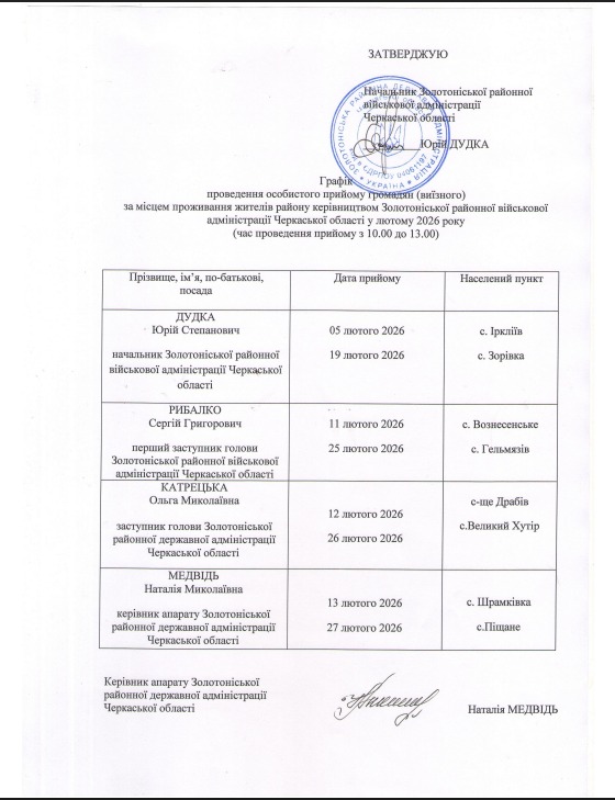Графік виїзних прийомів громадян керівництвом Золотоніської районної військової адміністрації Черкаської області.