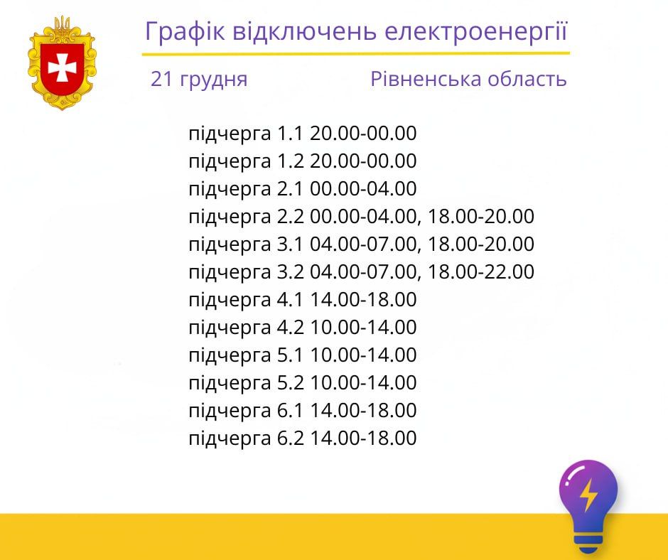 Графік відключень на середу, 21 січня, ОНОВЛЕНО:
