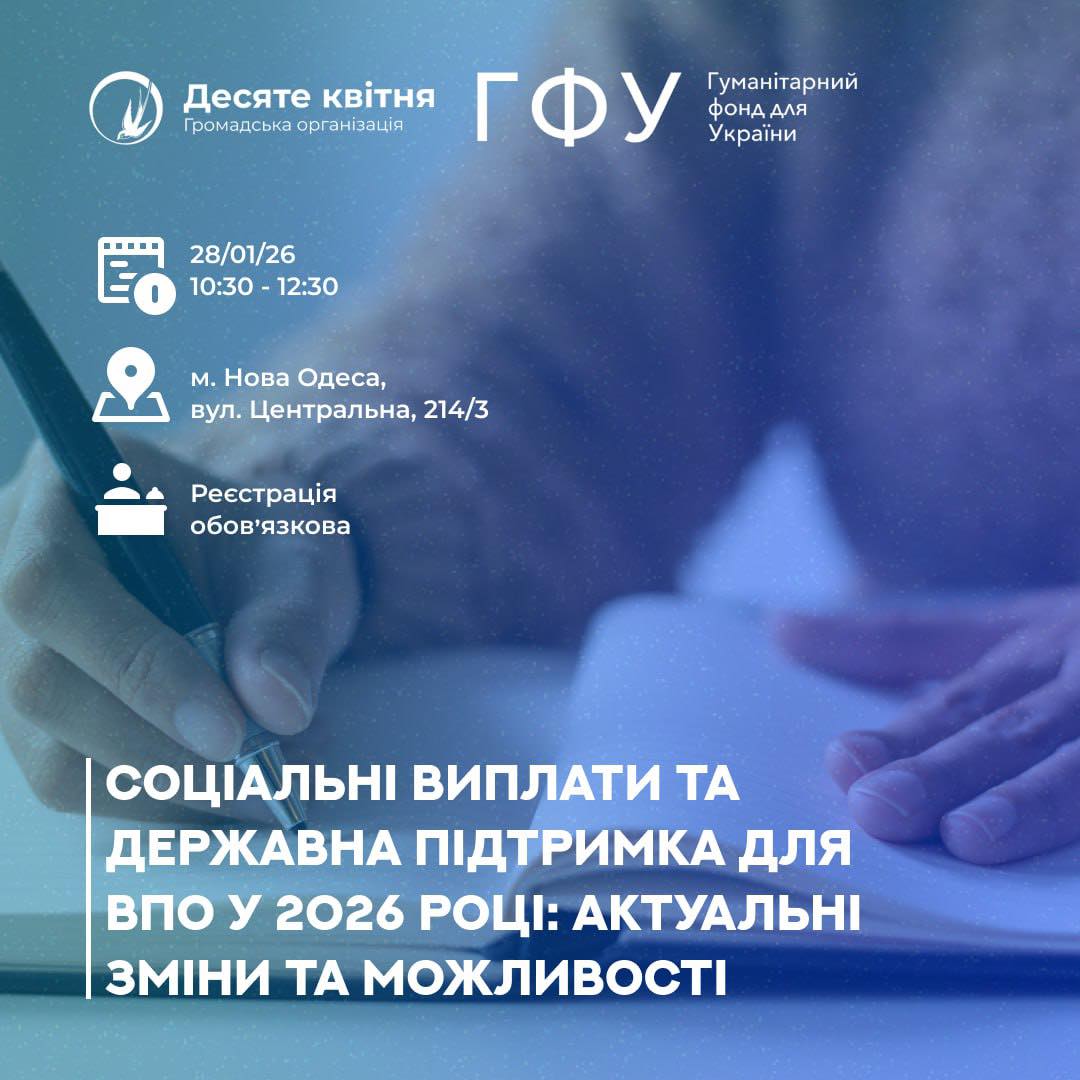 Громадська організація «Десяте квітня» запрошує внутрішньо переміщених осіб до участі в інформаційній сесії, спрямованій на підвищення обізнаності щодо державних соціальних виплат та програм підтримки для ВПО у 2026 році.
