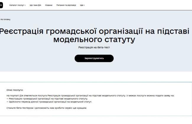 На порталі Дія було розпочато бета-тестування нового сервісу. Тепер усього за 30 хвилин можна зареєструвати нову громадську організацію або перевести чинну ГО на діяльність на основі модельного статуту.