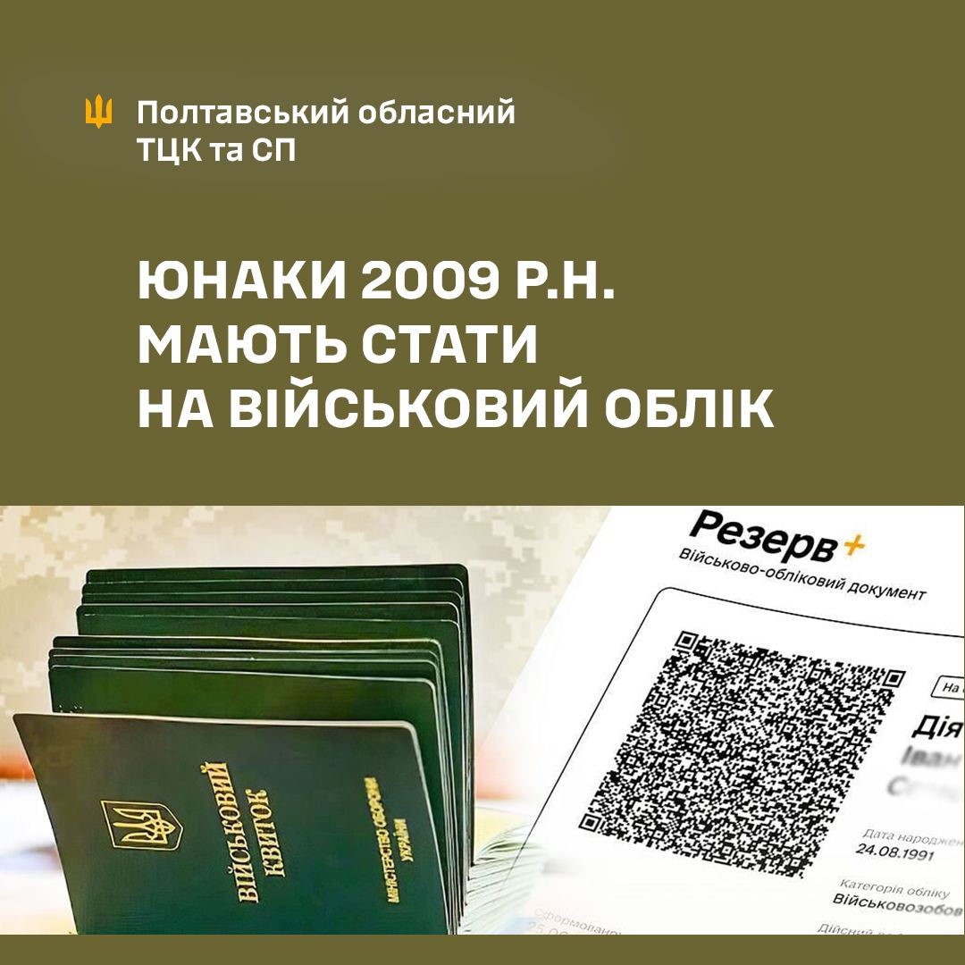 Громадяни України чоловічої статі, яким у 2026 році виповнюється 17 років, до 31 липня повинні стати на військовий облік призовників #ТЦК_інформує