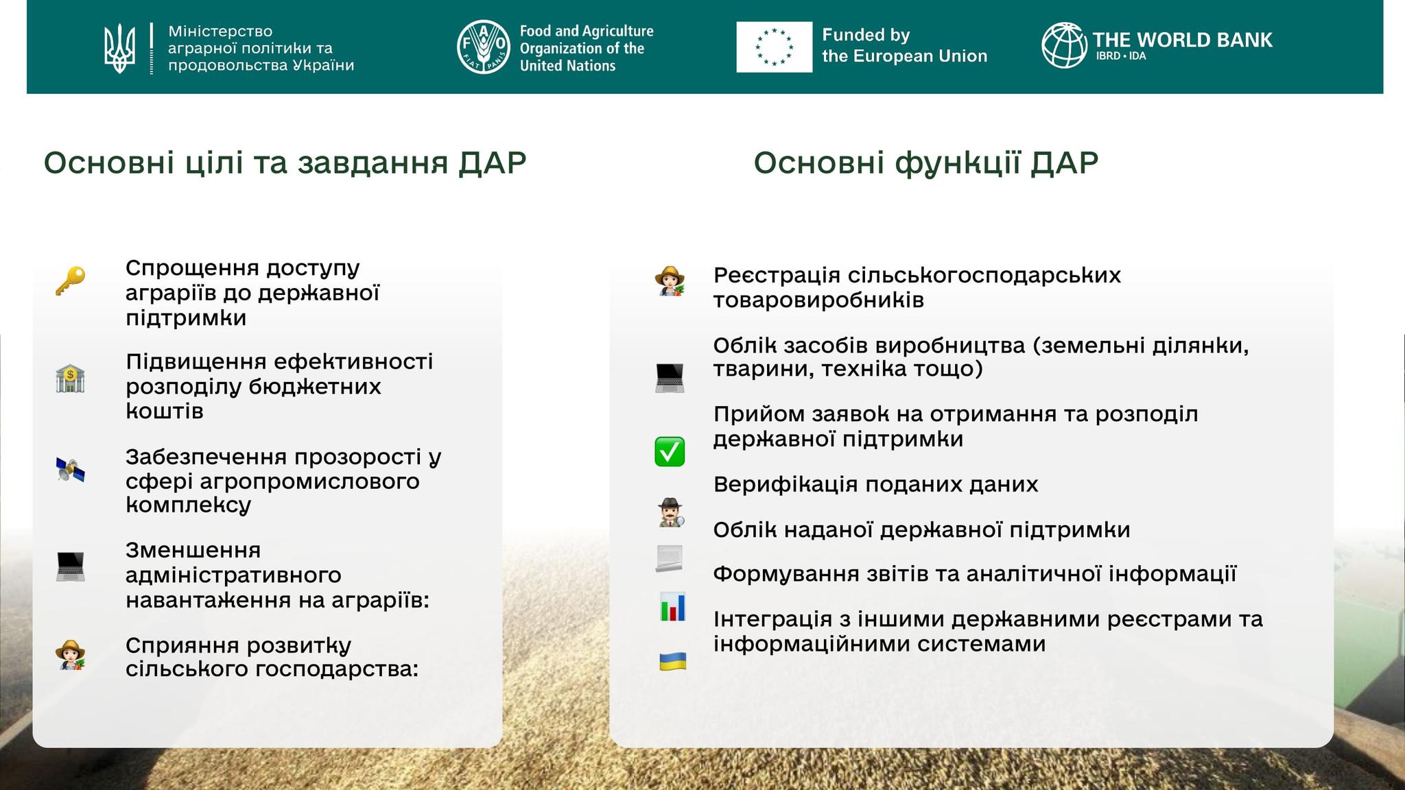 Відповідно до положень Рамкової Угоди між Україною та Європейським Союзом щодо спеціальних механізмів реалізації фінансування Союзу для України Міністерство аграрної політики та продовольства України здійснює заходи щодо реалізації індикатора 12.6 «Впровадження надання підтримки через ДАР» Плану України для забезпечення 80 % державної підтримки, яка буде впроваджена через Державний аграрний реєстр до першого кварталу 2025 року.