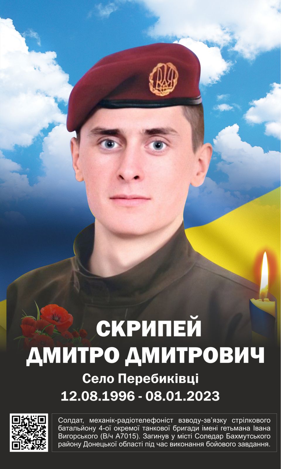ДМИТРО СРИПЕЙ народився 12 серпня 1996 року в селі Перебиківці. Середню освіту здобув, навчаючись у Перебиковецькій середній школі. Потім навчання у місті Харкові на кухаря-кондитера. Далі служба у рядах Збройних Сил України. Після служби приймав участь у антитерористичній операції на сході. Коли розпочалася війна 24 лютого 2022 року Дмитро один із перших пішов захищати Україну. У складі 4-ї окремої танкової бригади імені гетьмана Івана Виговського він упродовж десяти місяців мужньо відбивав атаки ворога на Херсонщині та Донеччині. І свій військовий обов’язок він виконав до останнього захищаючи суверенітет та незалежність України…