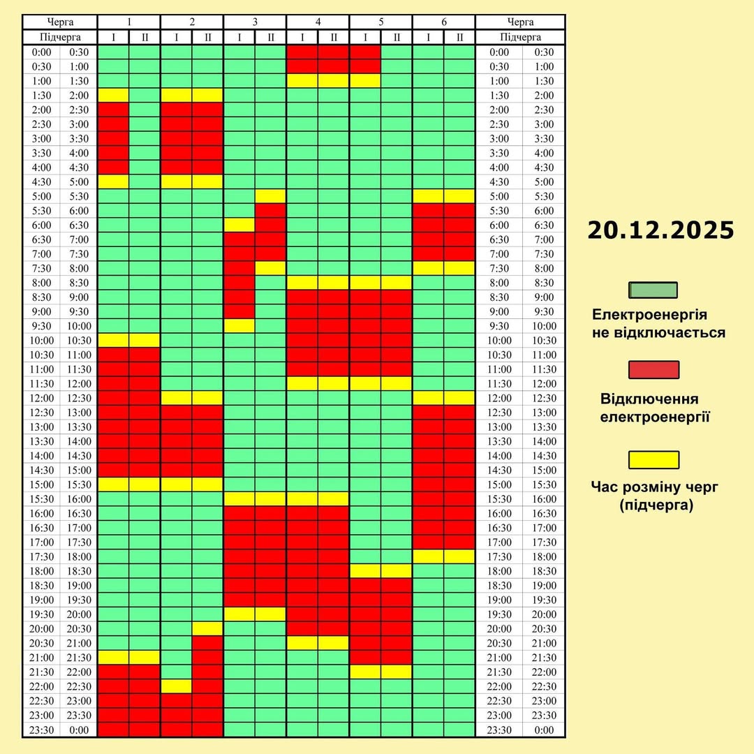 👇Прогнозовано, протягом 20 грудня будуть діяти наступні графіки погодинних відключень: