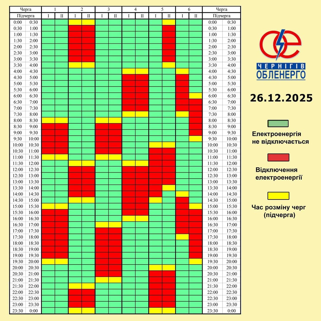 👇Прогнозовано, протягом 26 грудня будуть діяти наступні графіки погодинних відключень: