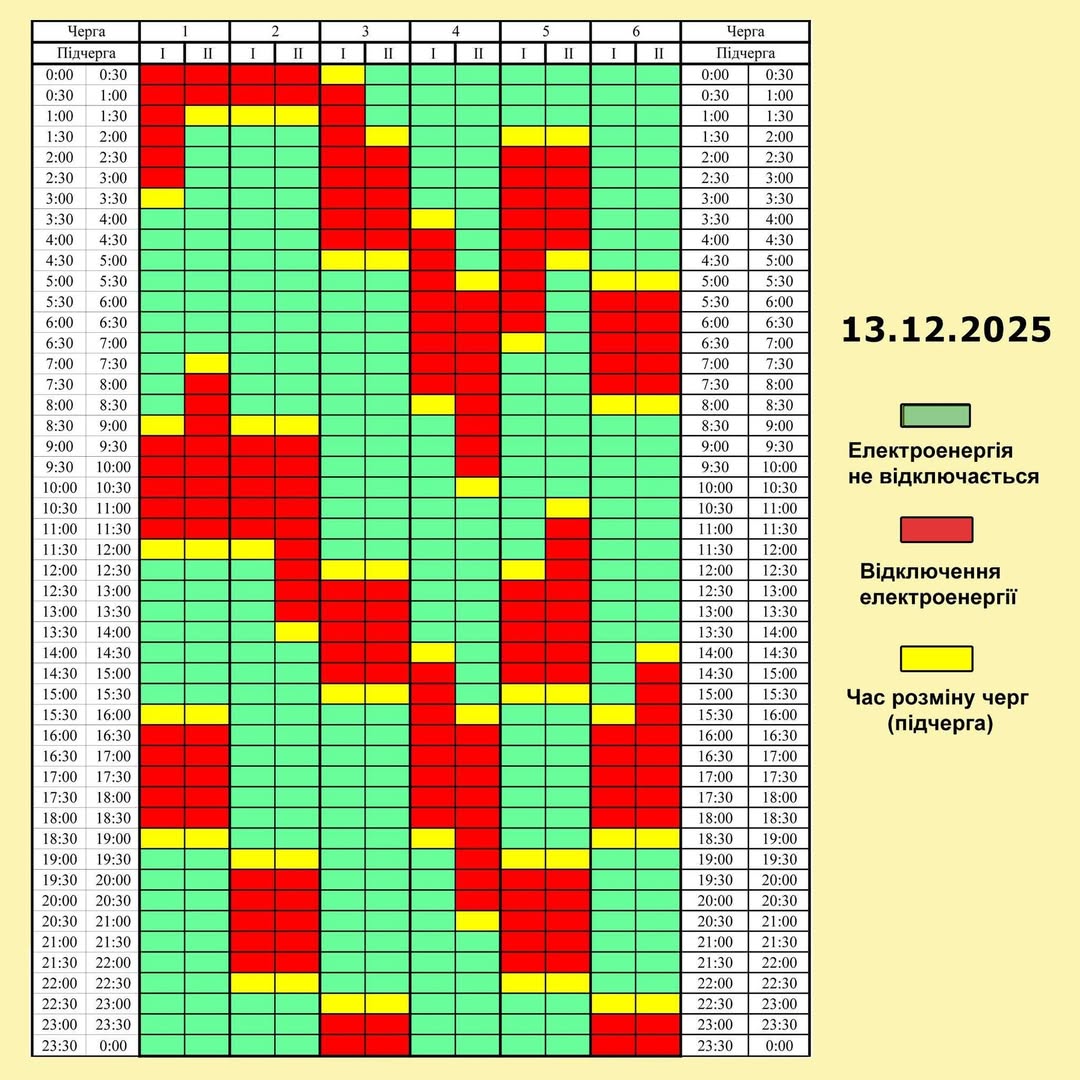 👇Прогнозовано, протягом 13 грудня будуть діяти наступні графіки погодинних відключень: