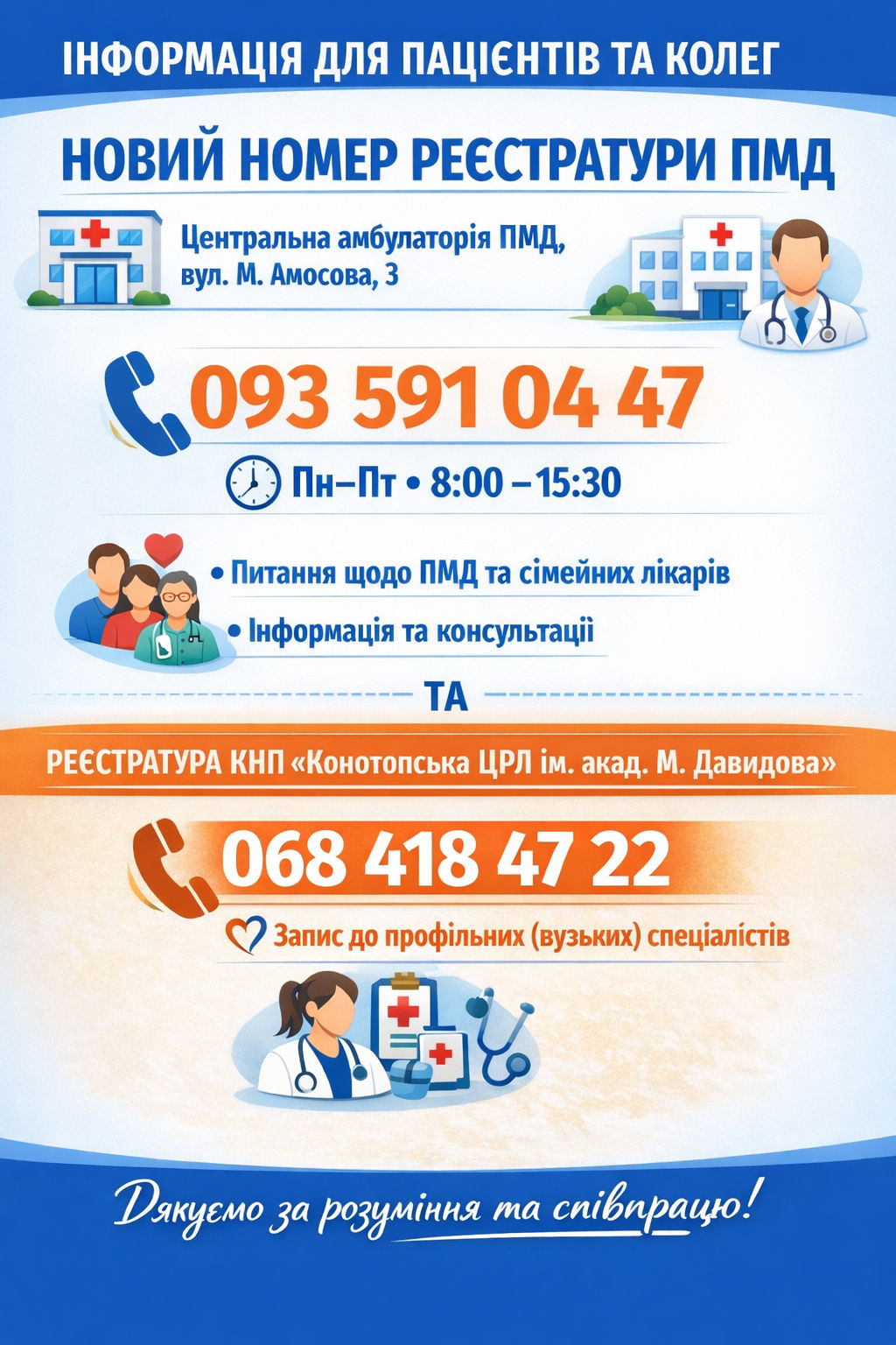 Для покращення організації роботи у КНП “Центр первинної медико-санітарної допомоги Конотопської МТГ” запроваджено власний номер реєстратури центральної амбулаторії ПМД