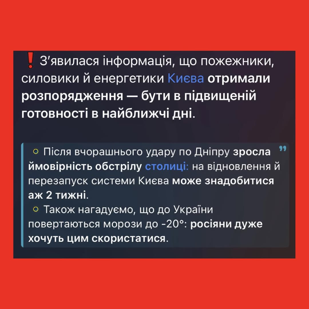 ℹ️ За наявною інформацією, через посилення загроз обстрілів та ускладнення погодних умов, зокрема очікуване зниження температури до –20°, можливі додаткові навантаження на об’єкти критичної інфраструктури та комунальні мережі.