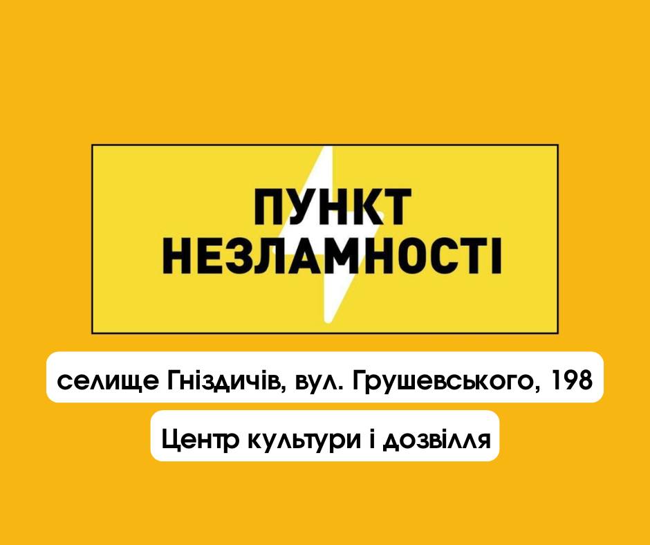 У зв’язку зі зниженням температури повітря, нагадуємо про роботу Пункту незламності за адресою селище Гніздичів, вул. Грушевського, 198 (приміщення Центру культури і дозвілля).