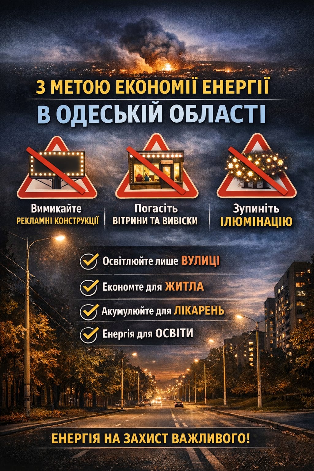 У зв’язку з систематичними обстрілами об’єктів критичної інфраструктури та відповідно до спільного наказу оперативно-стратегічного угруповання військ «Одеса» та Одеської обласної військової адміністрації «Про здійснення заходів з енергетичної безпеки на території Одеської області в умовах правового режиму воєнного стану», на території Одеської області необхідно вжити превентивних заходів для максимальної економії електричної енергії.