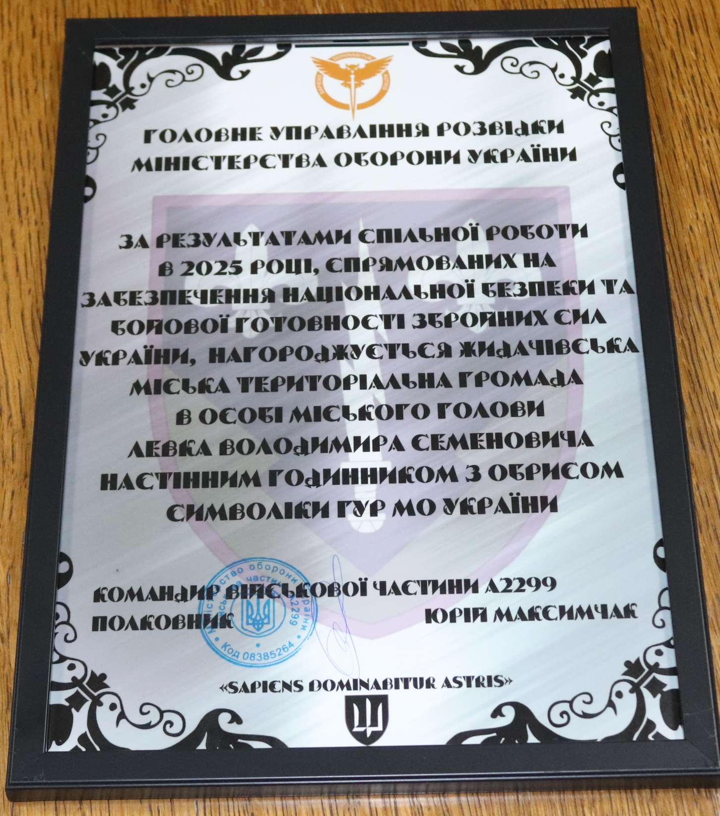 Головним управлінням розвідки Міністерства оборони України за результатами спільної роботи в 2025 році, спрямованих на забезпечення національної безпеки та бойової готовності Збройних Сил України, нагороджено Жидачівську міську територіальну громаду настільним годинником з обрисом символіки ГУР МО України.