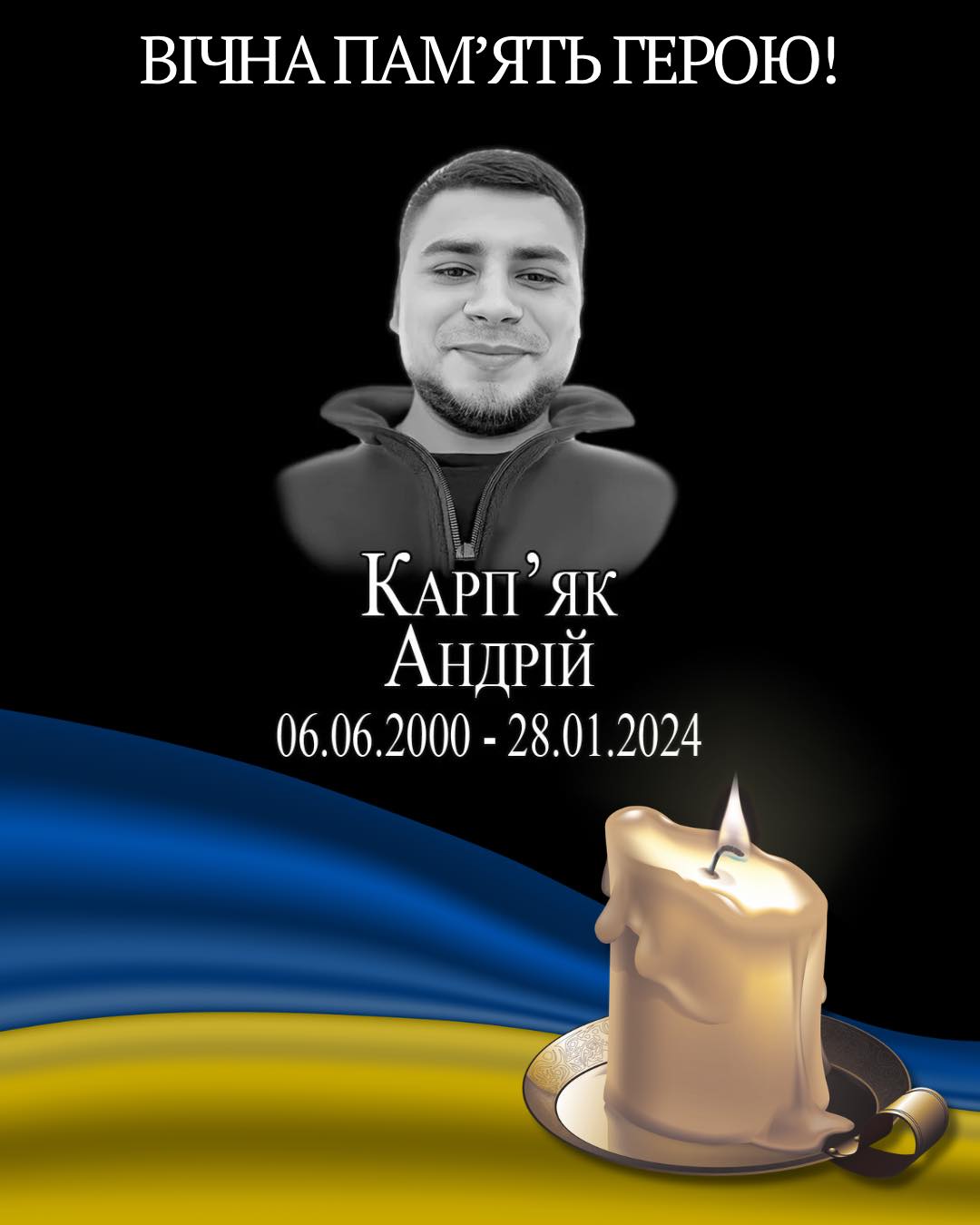 🕯Два роки тому поблизу села Роботине Запорізької області загинув наш Герой – Карпʼяк Андрій Петрович (06.06.2000 – 28.01.2024).