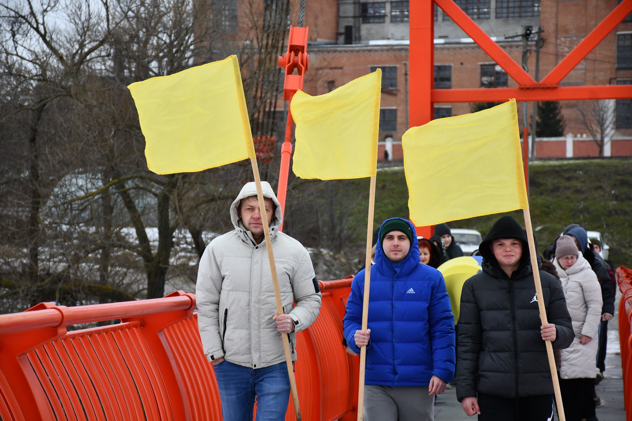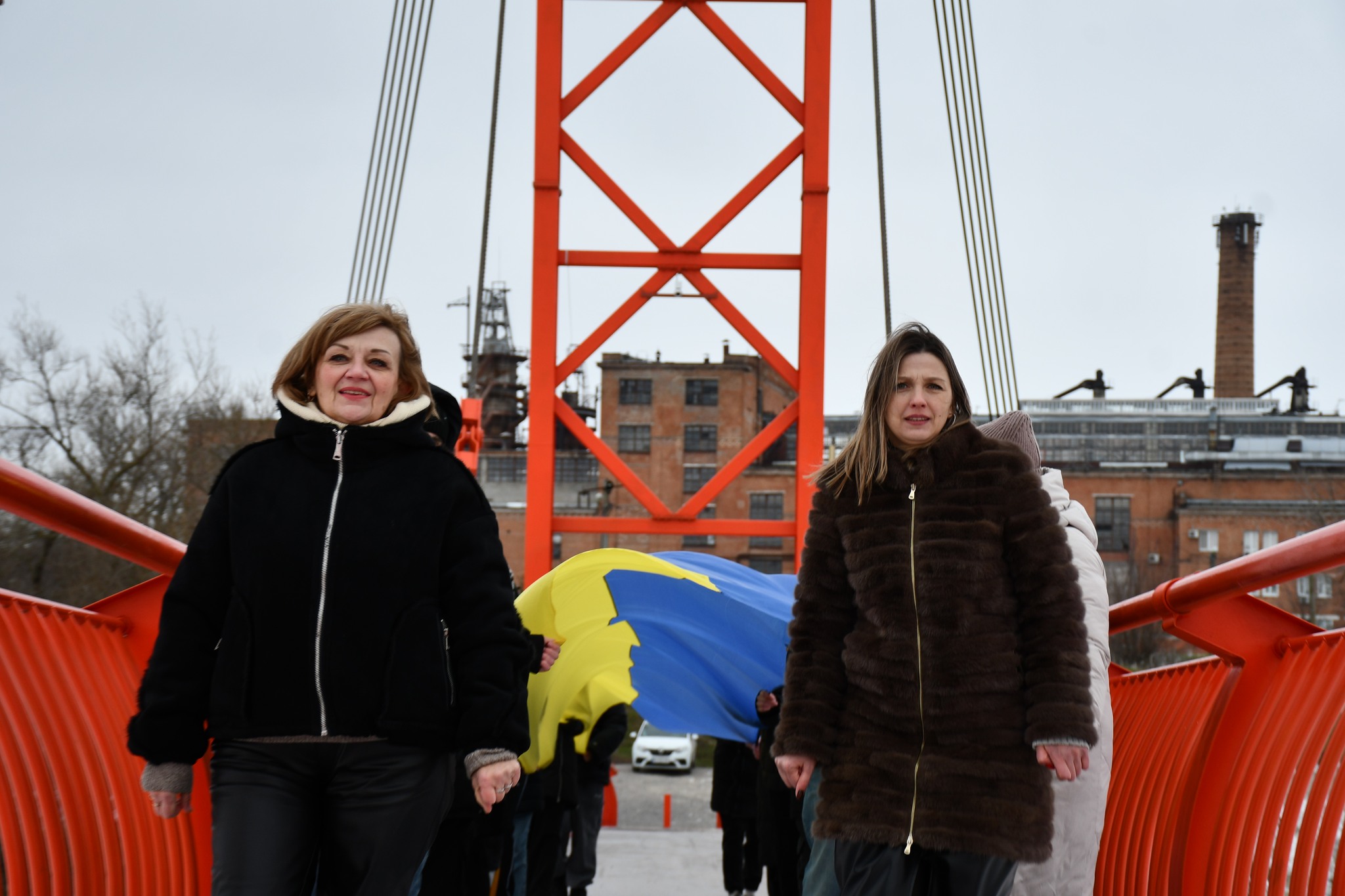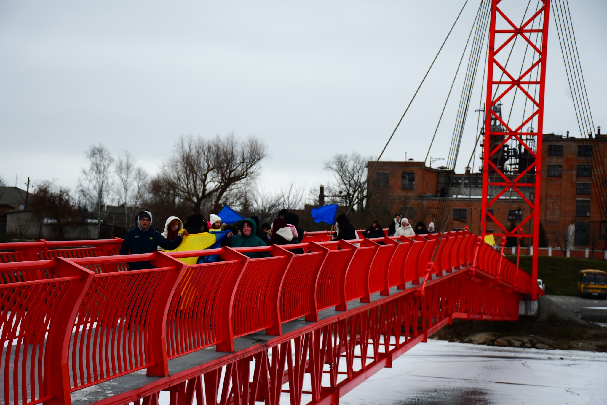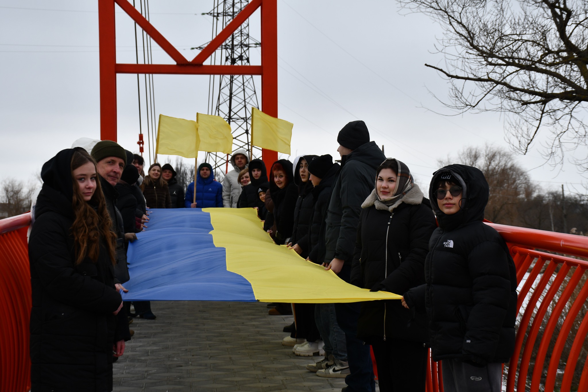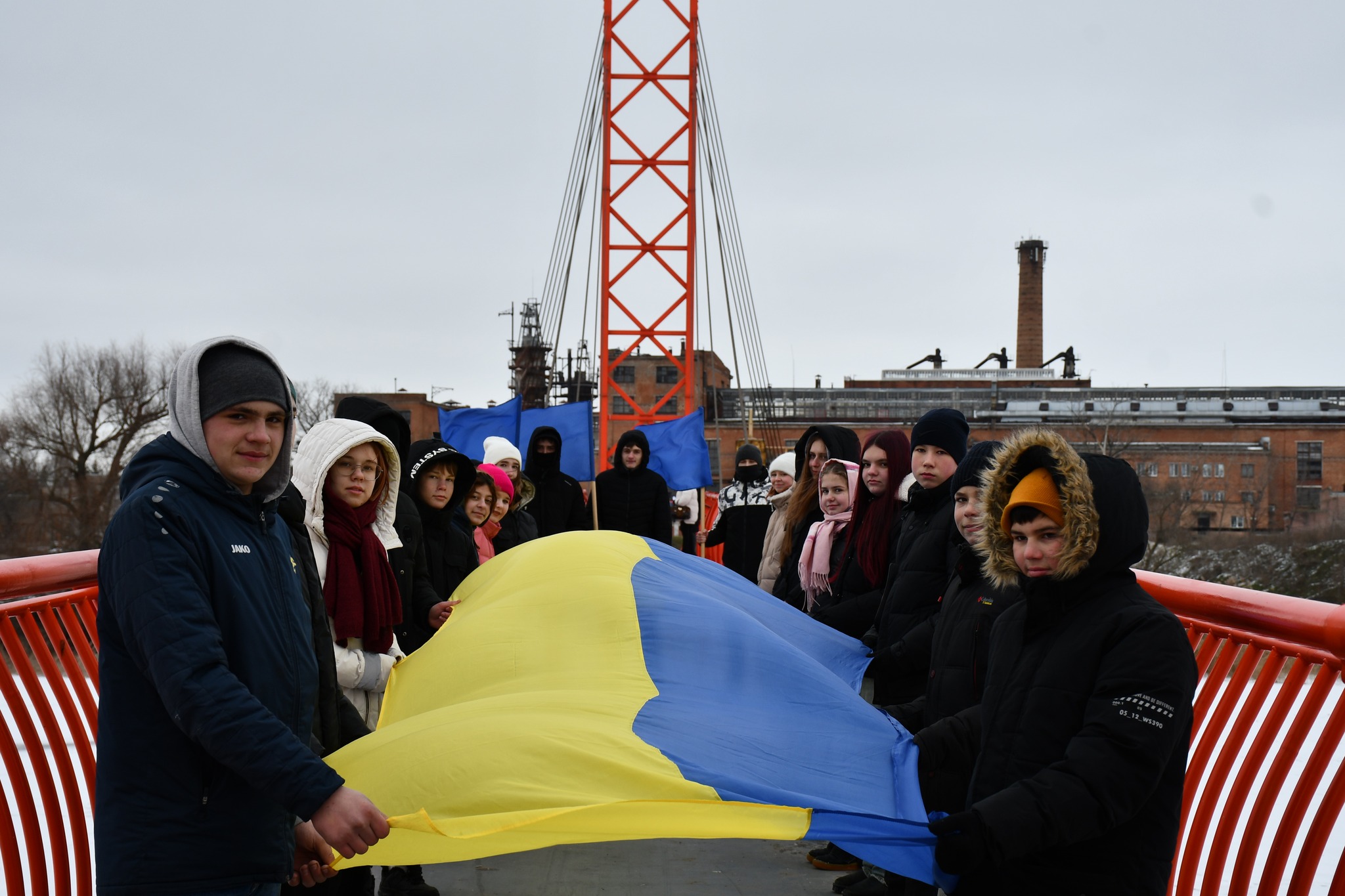 Учні двох ліцеїв громади вийшли на пішохідний міст через Інгулець і з’єднали два великі Державні Прапори між Войнівкою та Приютівкою. Так міст став Мостом Єдності – не умовно, а по-справжньому.