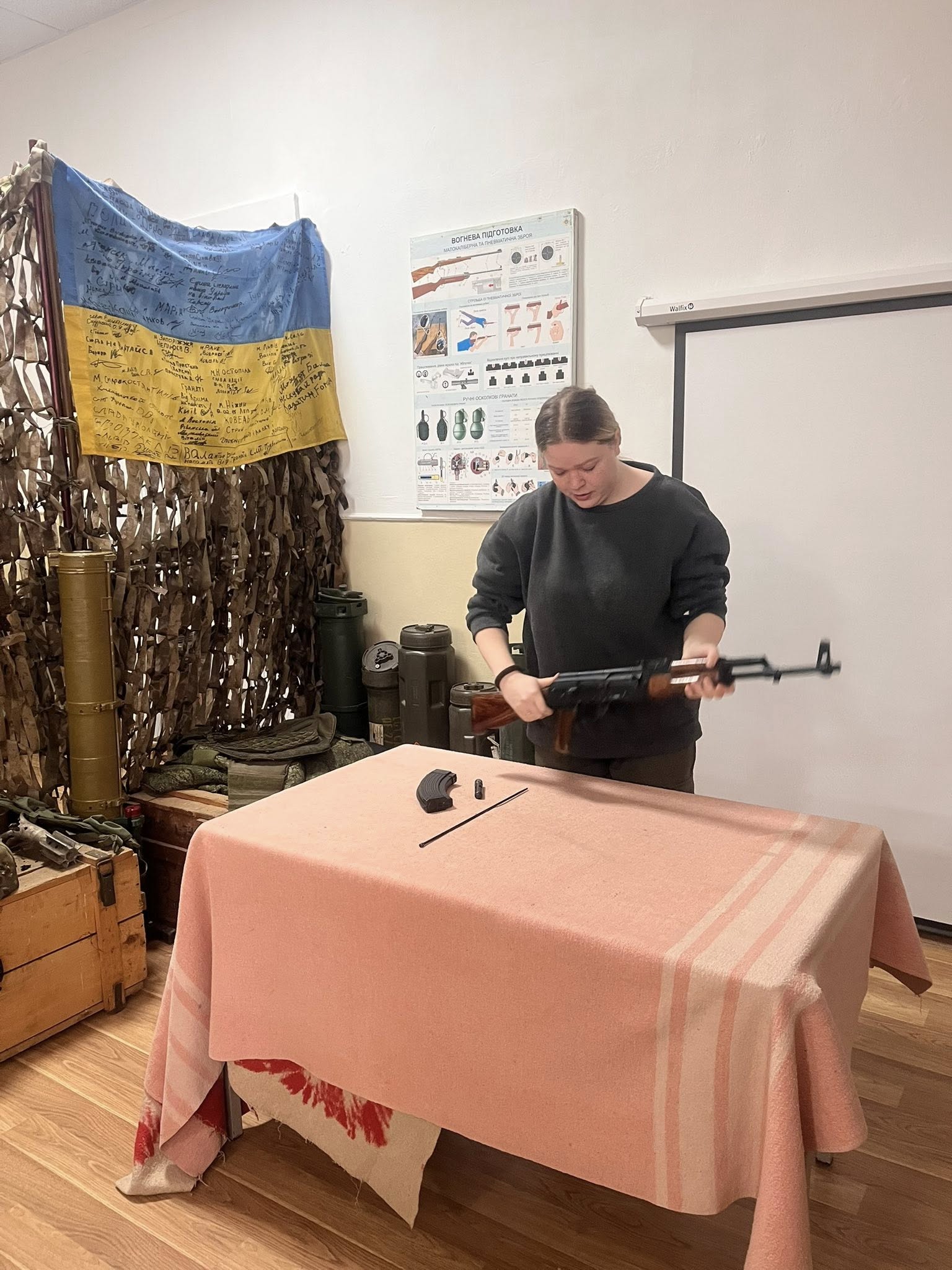 Після цього Софія коротко розповіла свою історію як ветерана та з радістю показала учням, як правильно розбирати та збирати автомат АК-74, розповідала про його будову та назви основних деталей. Для дітей це був живий і пізнавальний досвід.