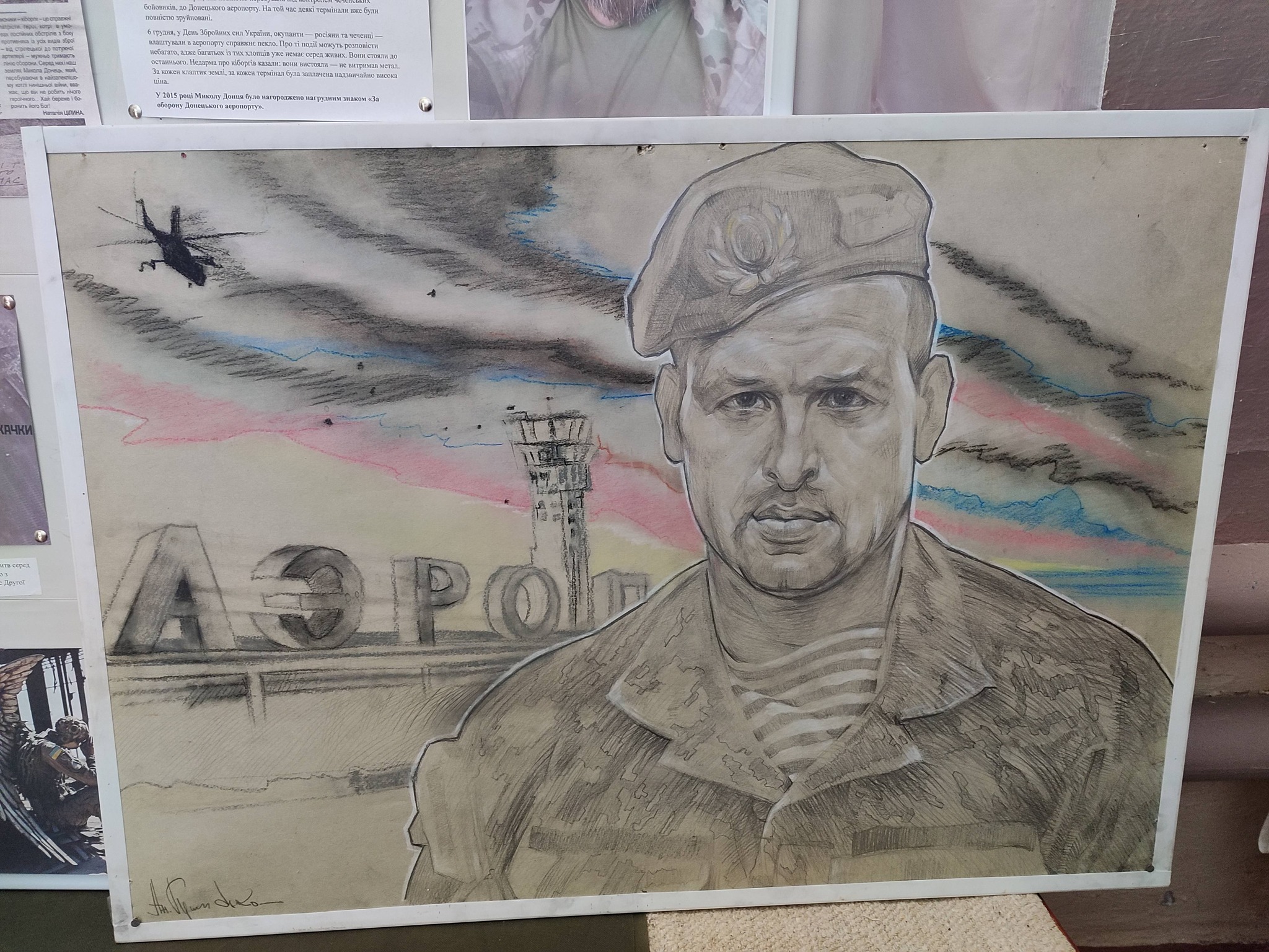 Також у нашому закладі діє постійний інформаційний стенд, присвячений кіборгам. Усі охочі можуть ознайомитися з ним особисто. До експозиції також додано роботу Криська А.К.