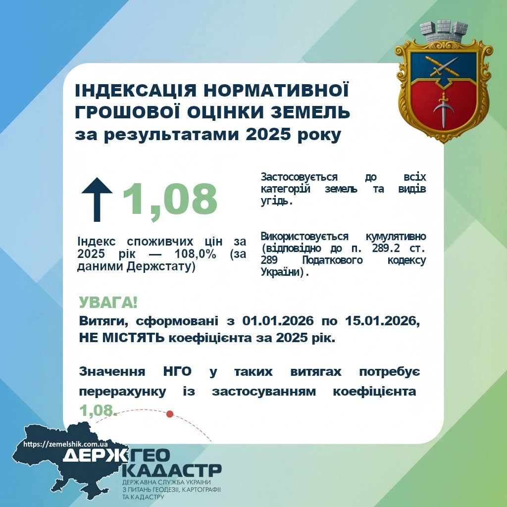 Окремо інформуємо, що витяги з технічної документації про нормативну грошову оцінку земельних ділянок, які були або будуть сформовані в період з 01 по 15 січня 2026 року, не містять коефіцієнта індексації за 2025 рік.