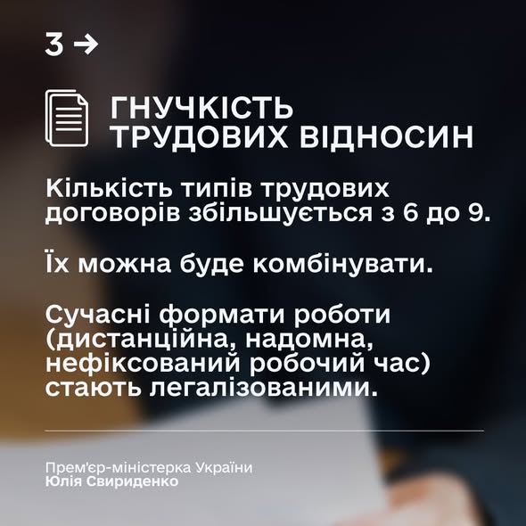 🔹 Гнучкі трудові договори. Кількість типів трудових договорів збільшується з 6 до 9. Кодекс чітко врегульовує сучасні формати роботи: дистанційна, надомна, нефіксований робочий час. Крім того, працівник зможе укладати з роботодавцем кілька типів трудових договорів.