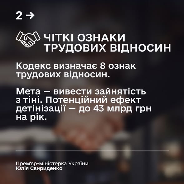 🔹 Кодекс закріплює чіткі ознаки трудових відносин. Документ визначає 8 ознак трудових відносин. Це допоможе зменшити правову невизначеність та вивести зайнятість з тіні. Попередні оцінки щодо детінізації ринку праці – 43 млрд грн на рік.
