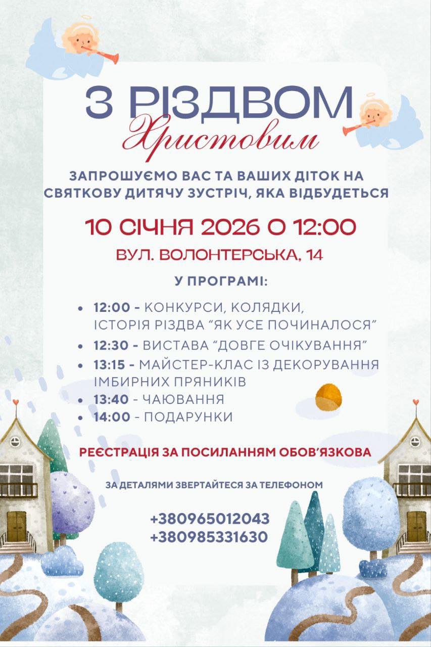 У суботу, 10 січня, у Церкві Святої Трійці (вул. Волонтерська, 14) відбудеться святкова різдвяна зустріч для дітей загиблих та зниклих безвісти Захисників України. Початок дійства — о 12:00.
