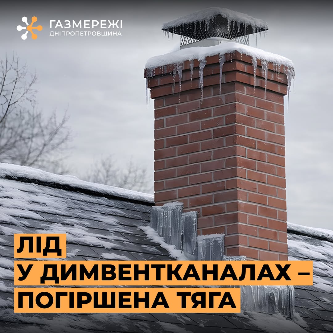 Дніпропетровська філія “Газмережі” акцентує увагу споживачів на необхідності перевіряти димові та вентиляційні канали (ДВК) на відсутність льоду. Зараз, коли на вулиці різко похолоднішало та тримаються сильні морози, робота теплової ізоляції погіршується, а димарі на будинках часто обмерзають. Це погіршує тягу та створює ризик накопичення чадного газу в оселі.