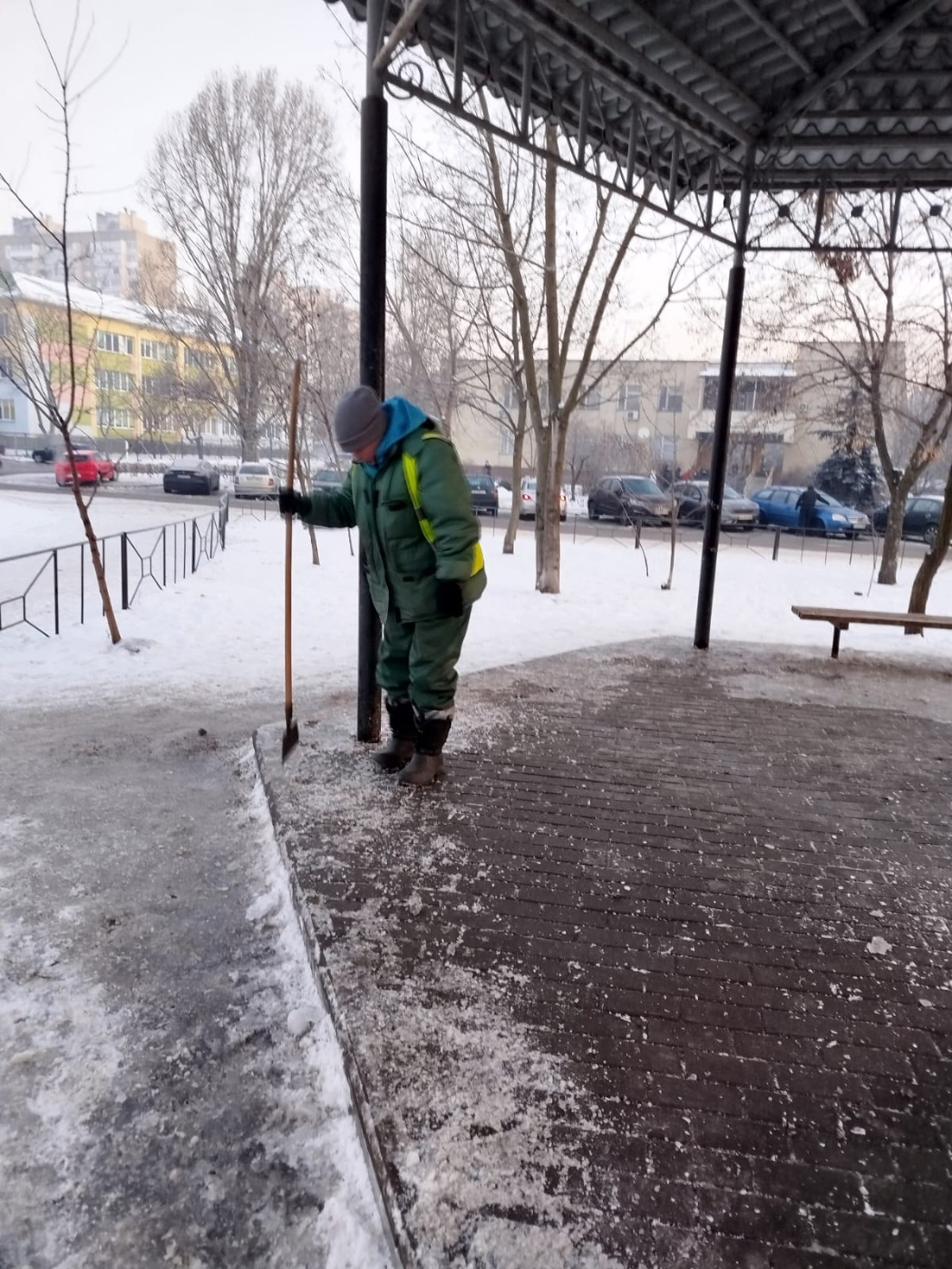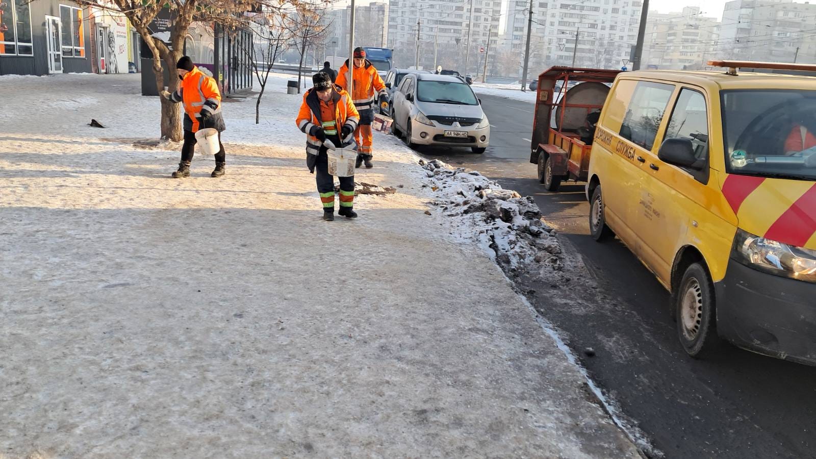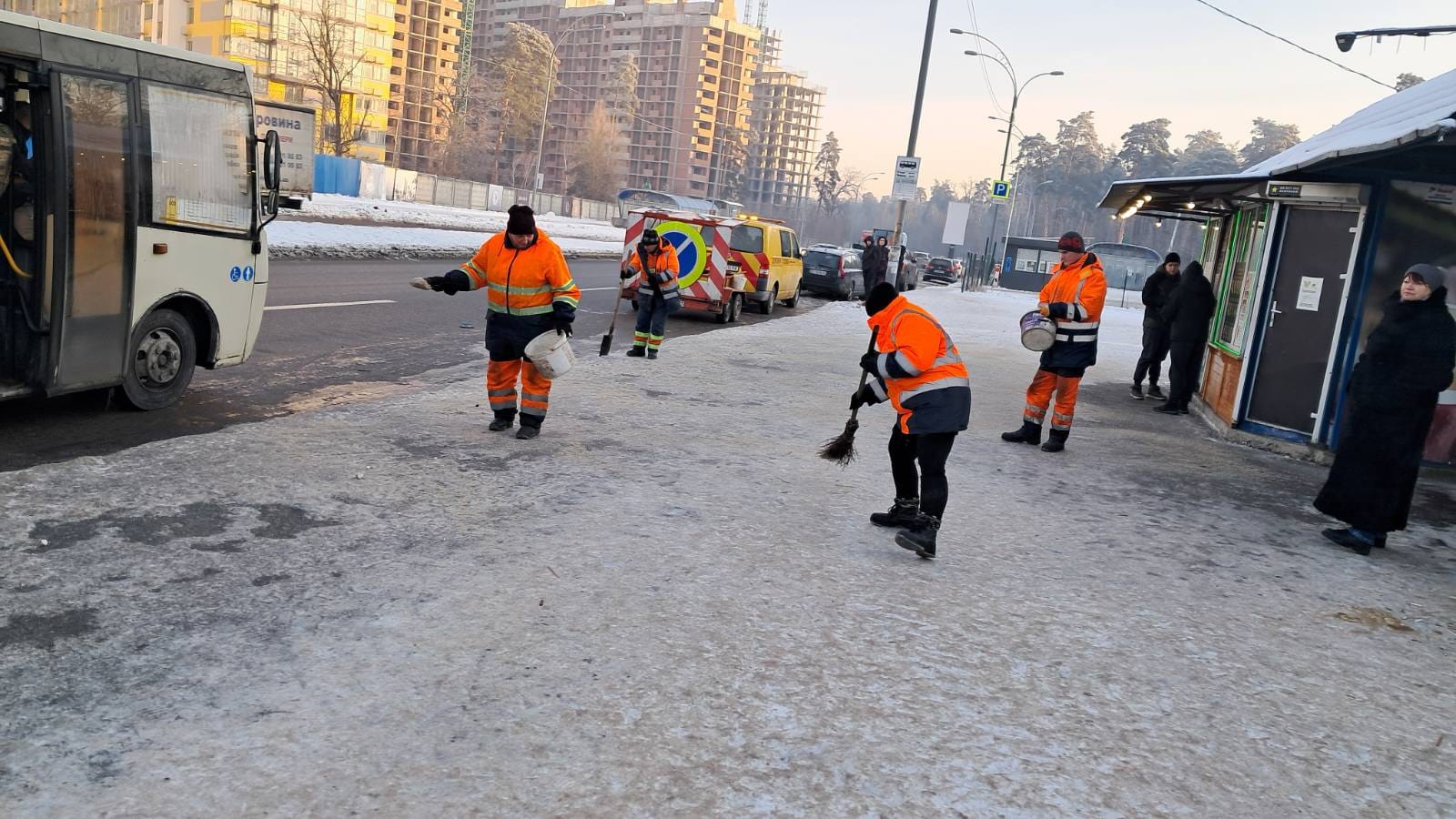Першочергово очищають від снігу та обробляють протиожеледними засобами головні магістралі, мости, спуски і підйоми. 30 працівників у складі бригад із ручного прибирання очищають від снігу та обробляють зупинки, вузькі тротуари, сходи, острівці безпеки, пішохідні переходи.