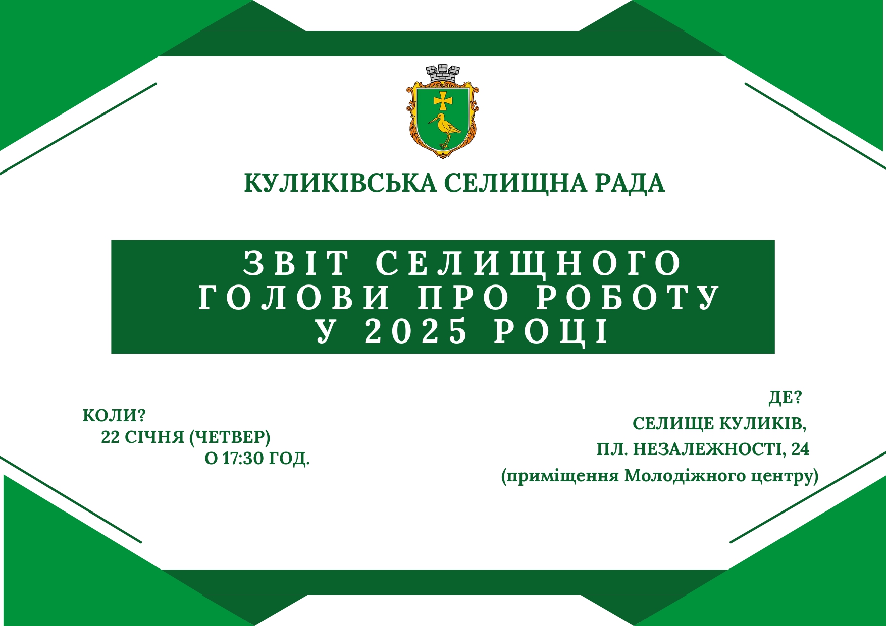 📜Звіт за 2025 рік, Куликівського селищного голови Лілія Бова відбудеться у четвер 22 січня 2026 року о 17:30 год. в приміщенні Молодіжного центру, за адресою селище Куликів, пл. Незалежності, 24.