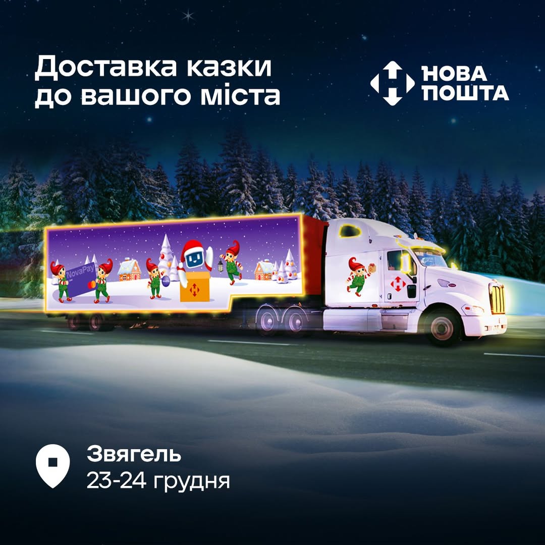 З 23 по 24 грудня чарівний трак Нової пошти відкриє у Звягелі святкову локацію «Казкове відділення». А кожні 20 хв для гостей буде проводитися інтерактивна міні-вистава — багато тепла, світла й справжньої зимової магії для дітей.