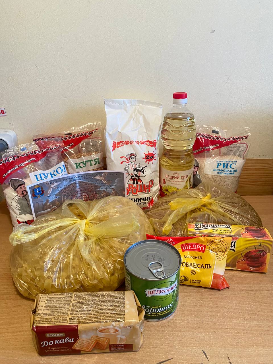 олія — 1 л, рис — 1 кг, цукор — 1 кг, борошно — 2 кг, гречана крупа — 2 кг, макаронні вироби — 800 г, кутя — 900 г, консервований горошок, майонез, печиво «До кави», пачка чаю.