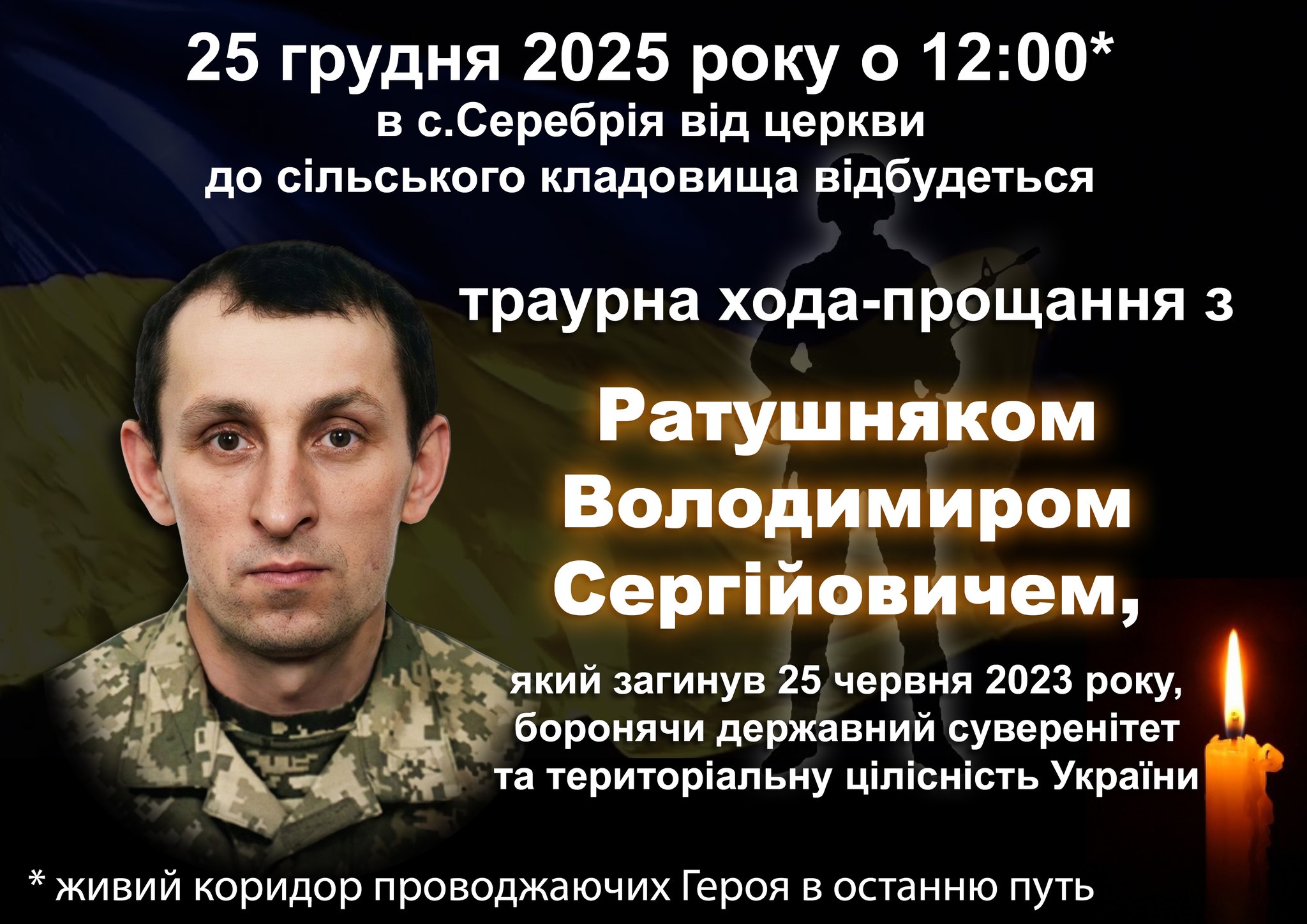 25 грудня 2025 року наша громада прощатиметься з воїном-захисником – Ратушняком Володимиром Сергійовичем, який загинув 25 червня 2023 року на Донеччині, боронячи державний суверенітет та територіальну цілісність України.