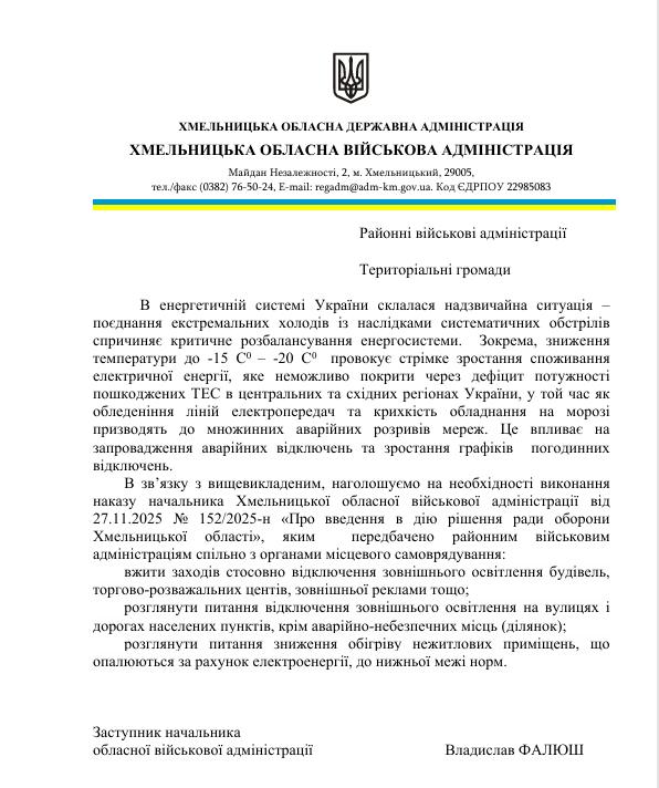 Через надзвичайну ситуацію в енергетичній системі України – поєднання екстремальних холодів із наслідками систематичних обстрілів, з урахуванням рекомендацій уряду (Постанова КМУ № 39 від 15 січня 2026 року «Про заходи щодо подолання наслідків надзвичайної ситуації державного рівня в електроенергетичних системах») та наказу Хмельницької обласної військової адміністрації від 27.11.2025 № 152/2025-н «Про введення в дію рішення ради оборони Хмельницької області», на території громади запроваджується тимчасове відключення зовнішнього освітлення.
