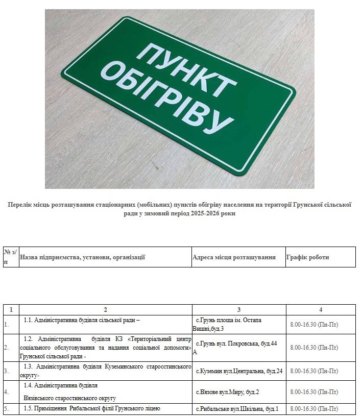 До відома мешканців Грунської громади повідомляємо про Перелік місць розташування стаціонарних пунктів обігріву населення на території Грунської сільської ради у зимовий період 2025-2026 роки.