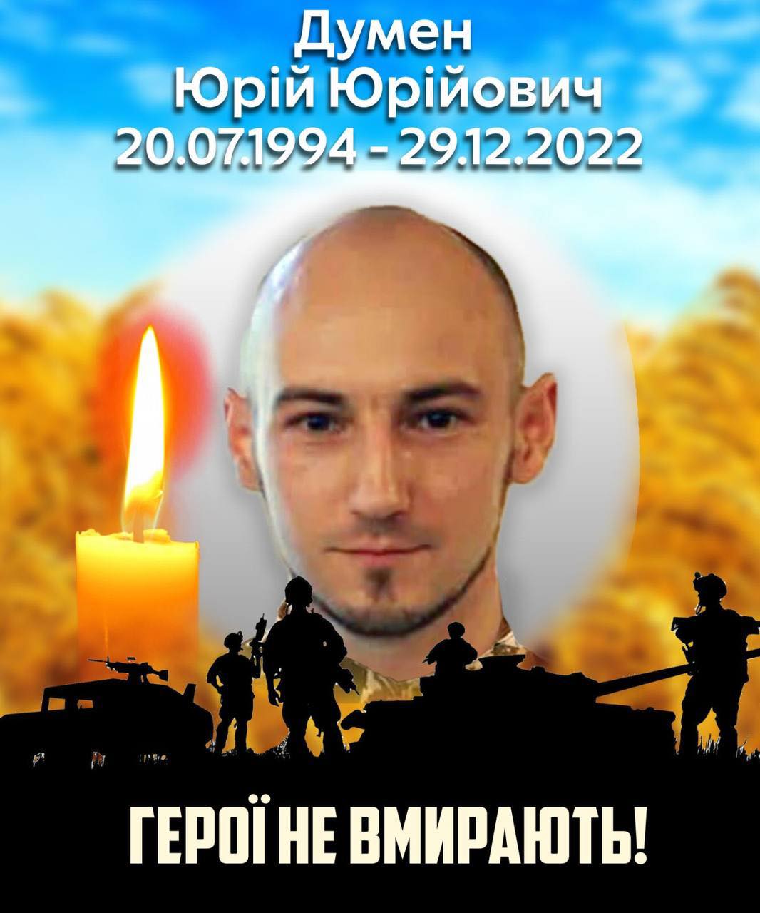 29 грудня 2022 року, виконуючи свій військовий обов’язок та обороняючи Україну від російської збройної агресії, головний сержант Юрій Думен героїчно загинув під час відбиття штурмових дій противника в районі населеного пункту Соледар Донецької області.