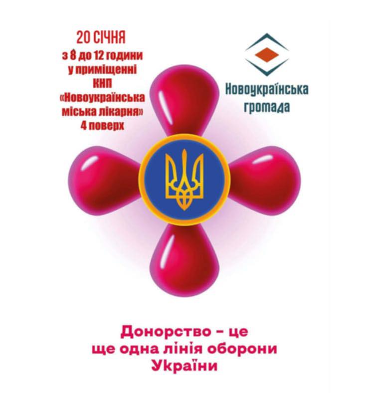 ❗У вівторок, 20 січня 2026 року, з 8 до 12 години у Новоукраїнці буде проводитись збір крові для військовослужбовців та цивільних громадян, які постраждали внаслідок бойових дій.