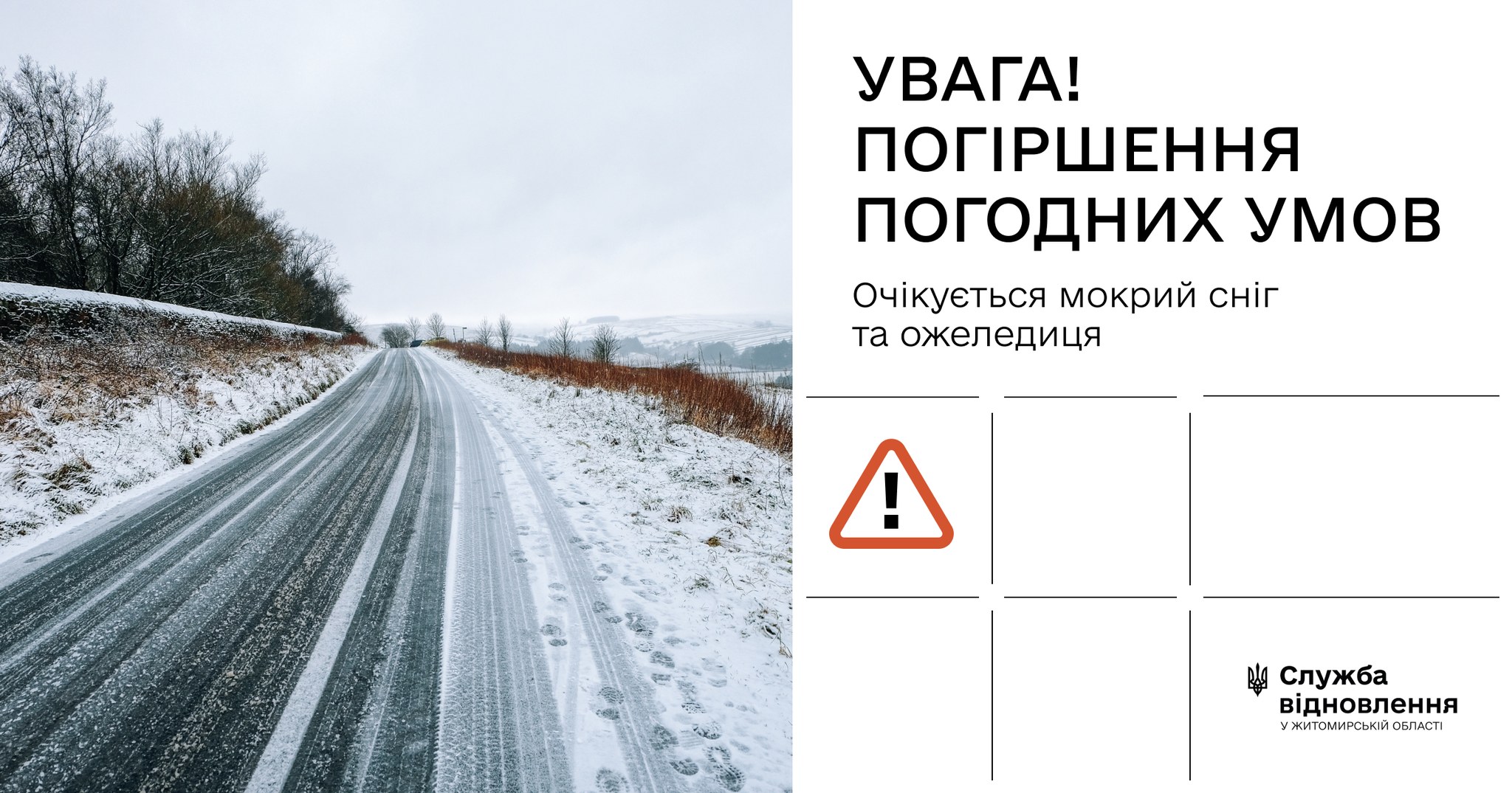 Упродовж 26 – 28 грудня, за повідомленням Гідрометцентру, на території Житомирської області очікуються опади у вигляді мокрого снігу та снігу, температура повітря підніматиметься вдень вище нуля, а вночі знову морозитиме.