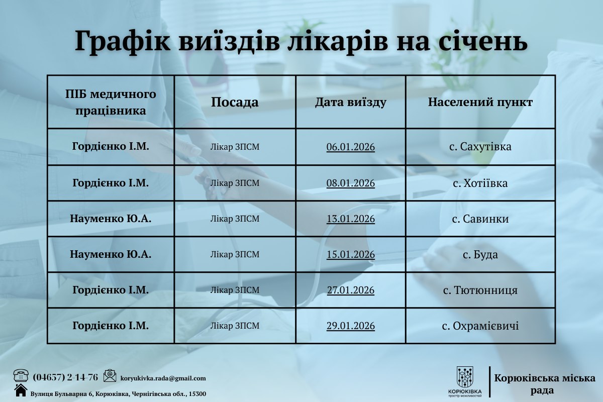 Інформуємо про графік виїздів медичних працівників у населені пункти громади у СІЧНІ 2026 року.