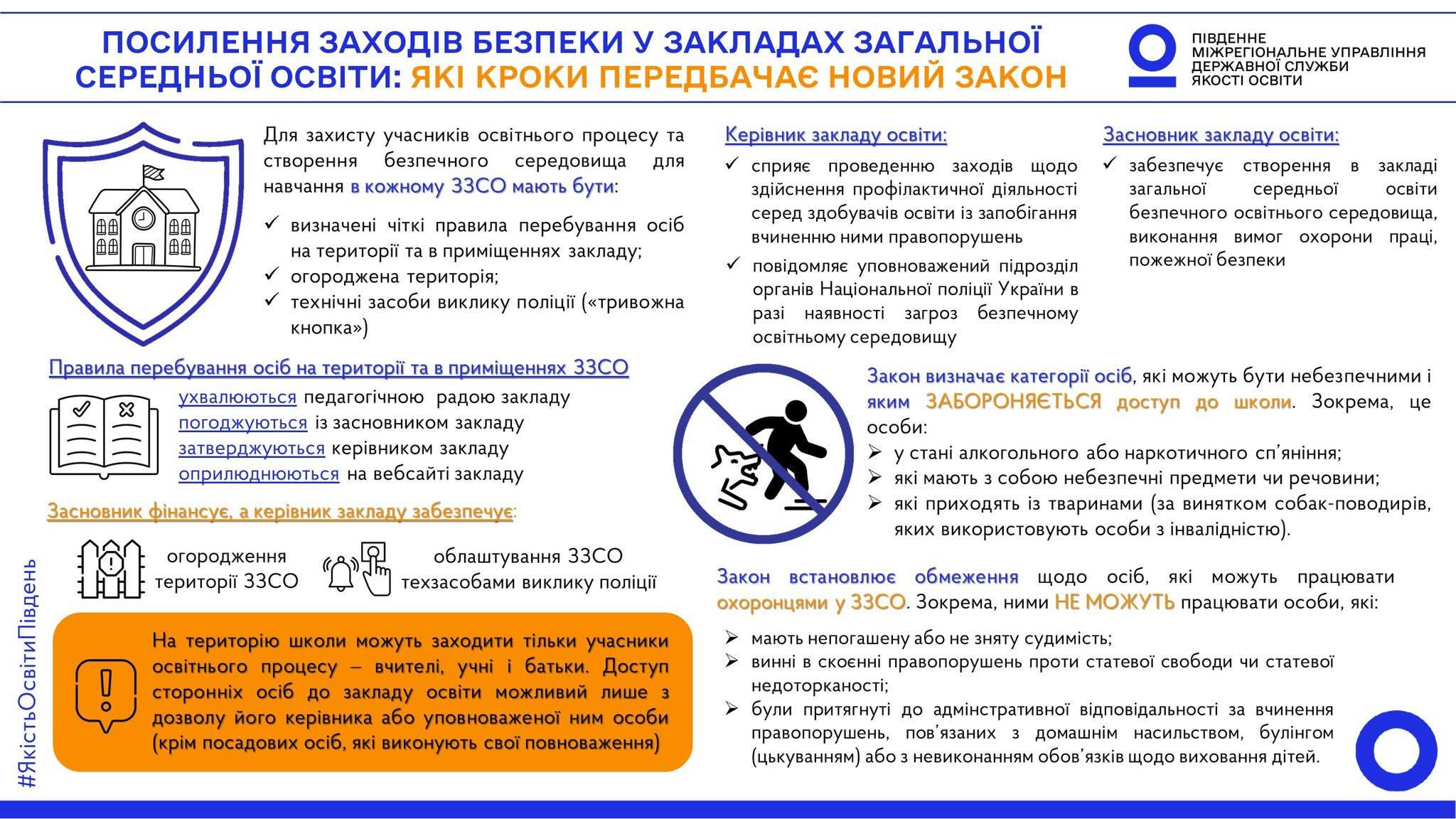 Наочно про те, яких ключових заходів за новим Законом мають ужити керівник та засновник школи задля посилення безпеки учасників освітнього процесу – у прикріпленій інфографіці від команди Південного міжрегіонального управління Державної служби якості освіти👇🏻