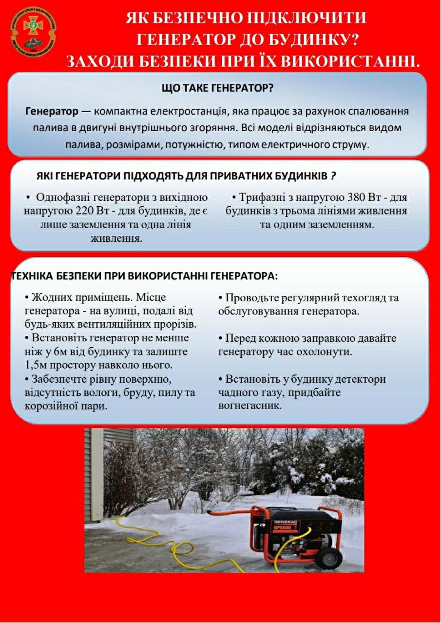 Закликаємо Вас ознайомитись з важливими пам’ятками на теми: “Якщо зникло опалення!””, “Як безпечно підключити генератор до будинку?” Заходи безпеки при їх використанні”, “Як вибрати газовий балон?”.
