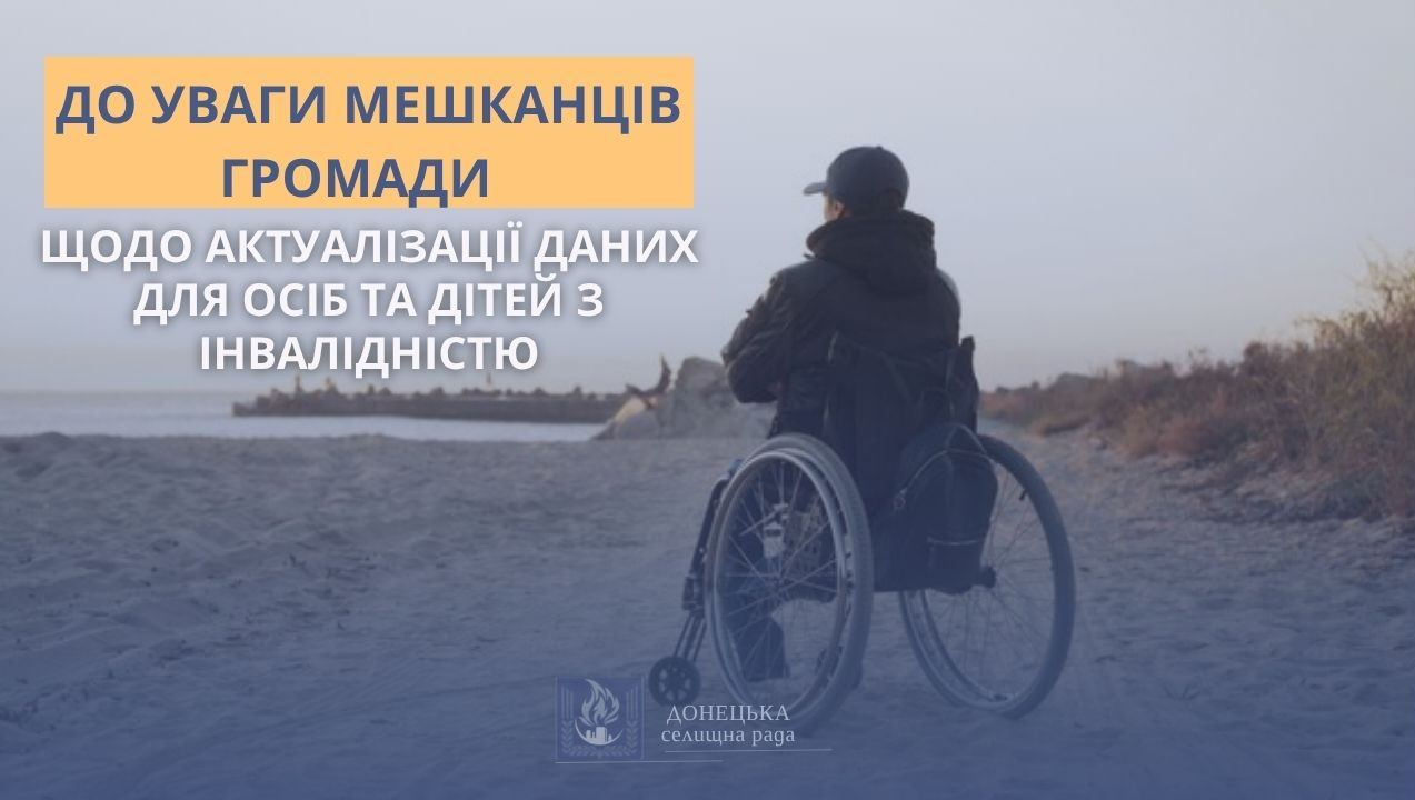 Просимо осіб з інвалідністю всіх категорій, а також сім’ї, в яких виховуються діти з інвалідністю, звернутися до Відділу соціального захисту населення Донецької селищної ради для актуалізації даних.