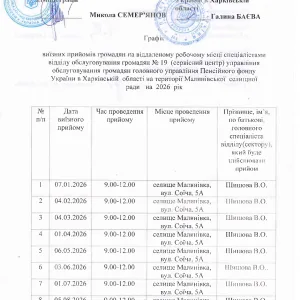 На офіційному сайті Малинівської селищної ради оприлюднено Графік виїзних прийомів громадян на 2026 рік на віддаленому робочому місці спеціалістами