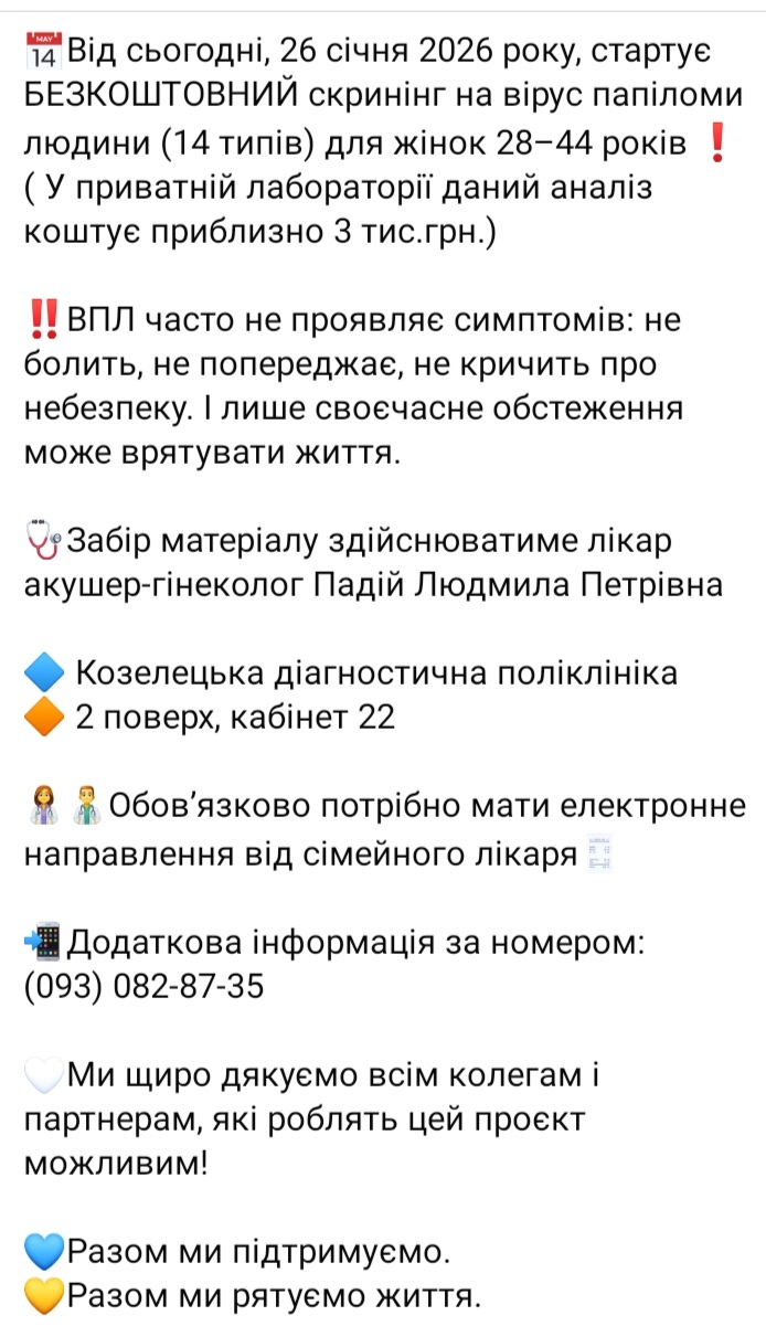У Козелецькому центрі первинної медико-санітарної допомоги стартує безкоштовний скринінг на вірус папіломи людини (ВПЛ) для жінок віком 28–44 роки.
