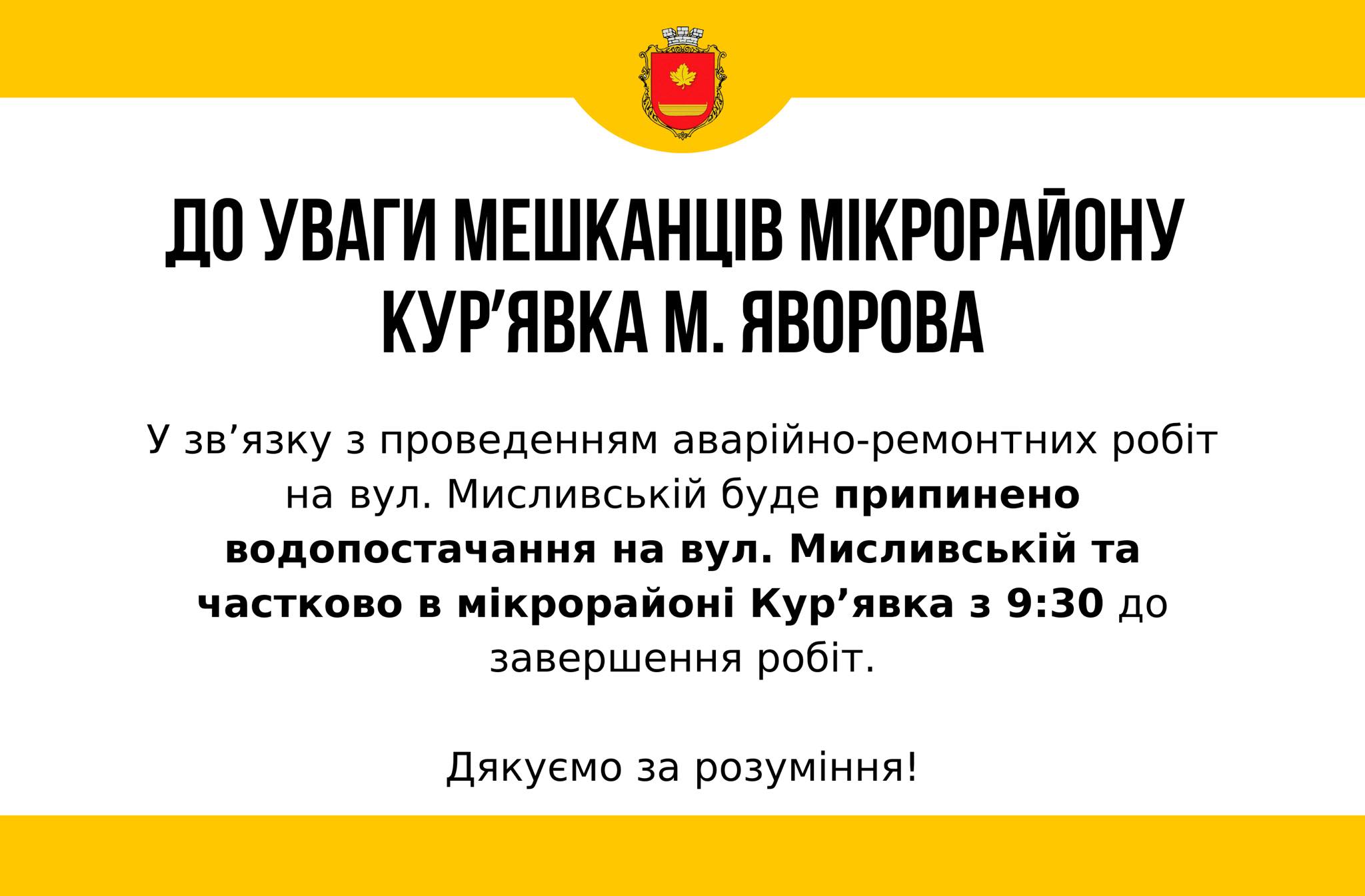 МКП «Яворіввода» повідомляє: у зв’язку з проведенням аварійно-ремонтних робіт на вул. Мисливській буде припинено водопостачання на вул. Мисливській та частково в мікрорайоні Курявка з 9:30 до завершення робіт.