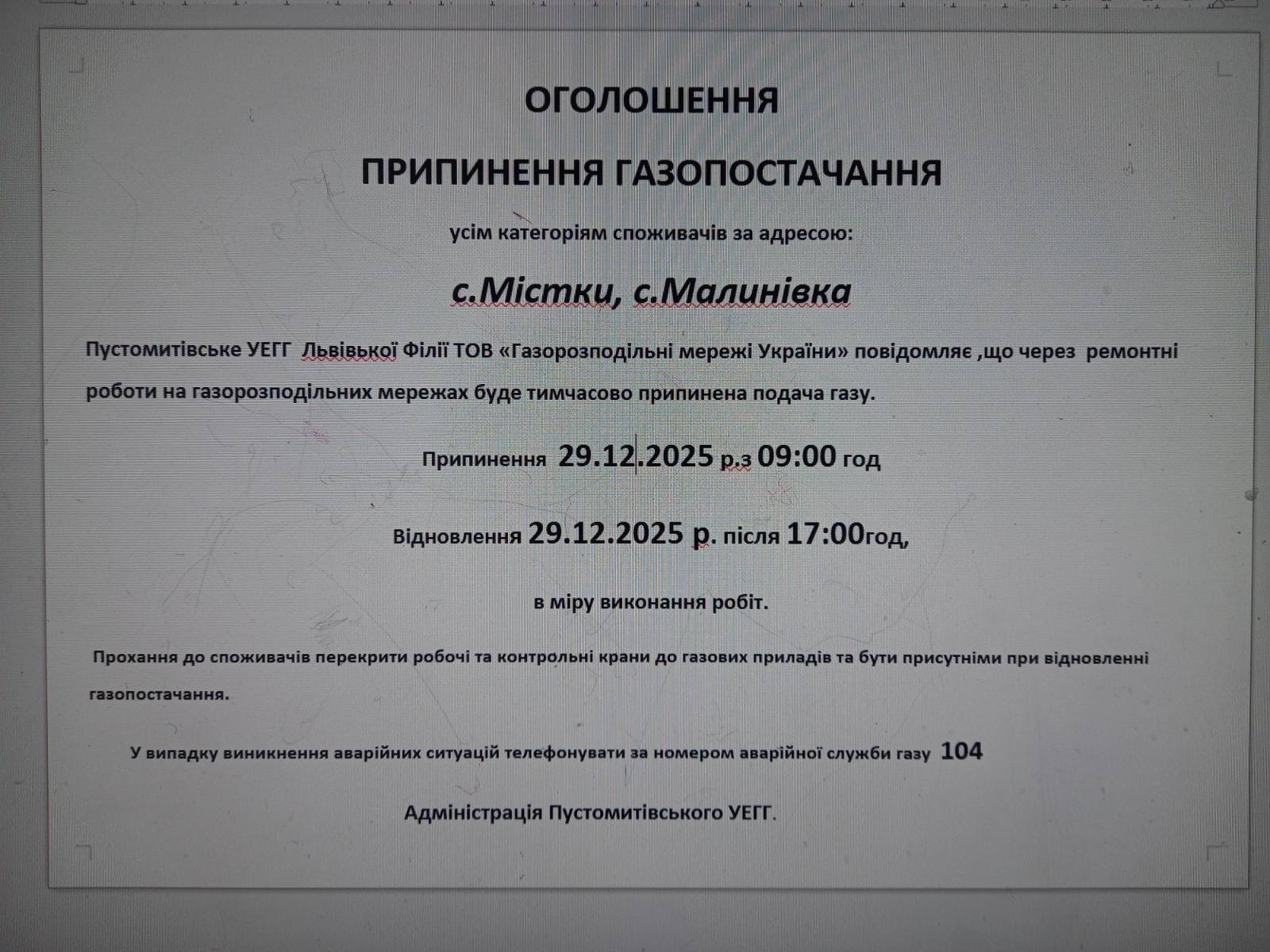📌Пустомитівське УЕГГ Львівської Філії ТОВ «Газорозподільні мережі України» повідомляє, що через ремонтні роботи на газорозподільних мережах буде тимчасово припинена подача газу усім категоріям споживачів у с. Містки та с. Малинівка.