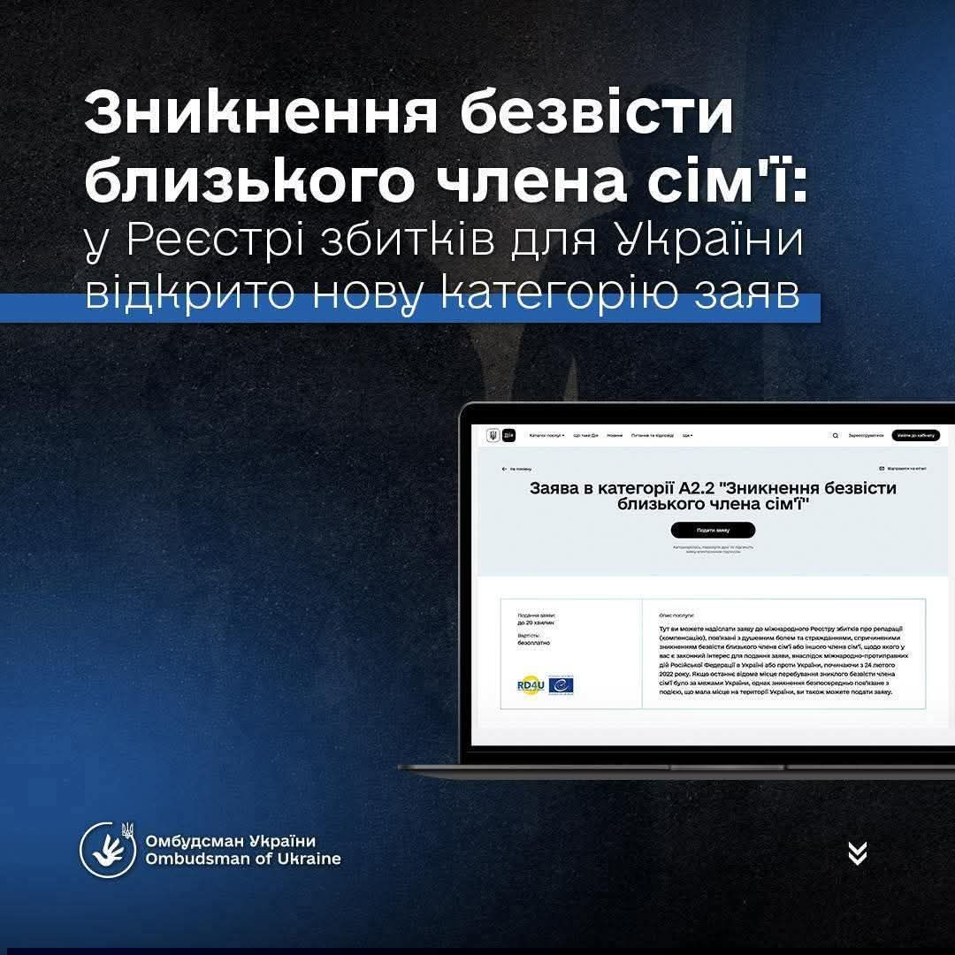☝️ У Реєстрі збитків для України (RD4U) відкрито нову категорію заяв: A2.2 “Зникнення безвісти близького члена сім’ї”.