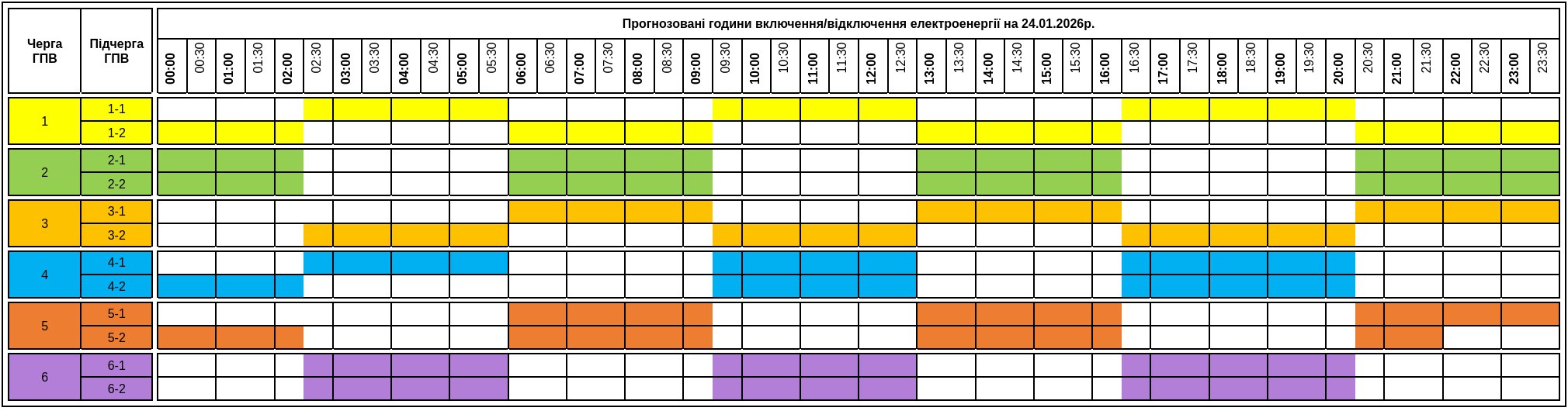 До уваги споживачів графік погодинних включень/відключень електроенергії на суботу, 24.01.2026