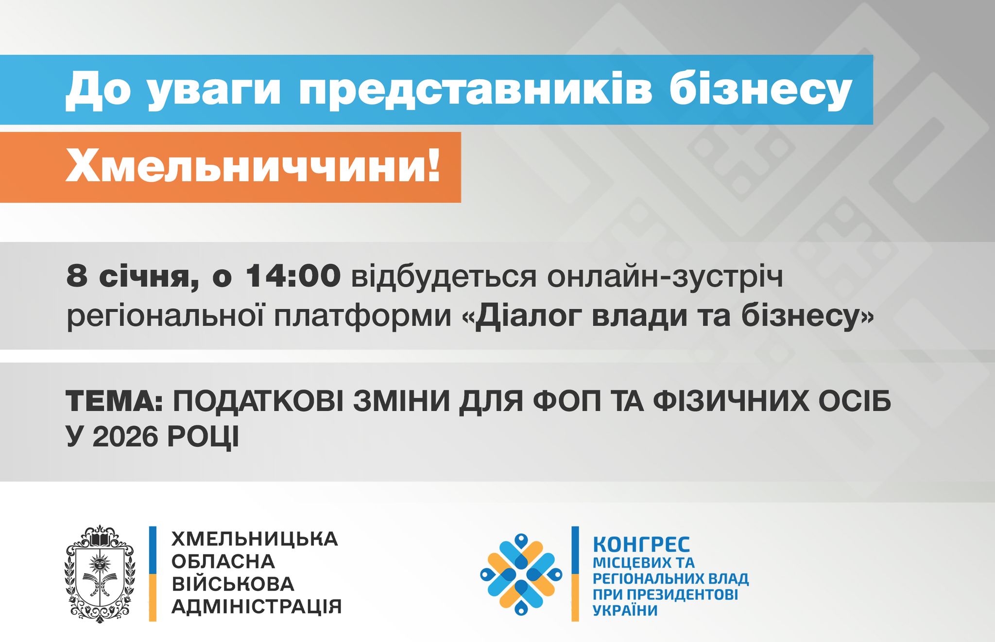 Запрошуємо Вас взяти участь у зустрічі в рамках регіональної платформи «Діалог влади та бізнесу», яка відбудеться у четвер, 08 січня, о 14:00 в онлайн-форматі. Тема зустрічі: «Податкові зміни для ФОП та фізичних осіб у 2026 році».