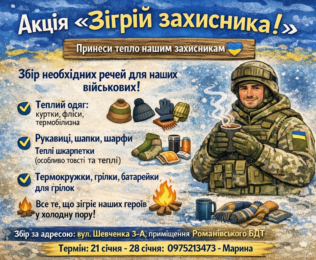Друзі, на вулиці холоднішає, і ми вирішили організувати акцію «Зігрій захисника». Нашим військовим зараз як ніколи потрібне наше тепло — і в прямому, і в переносному сенсі. Протягом тижня ми збираємо речі, які допоможуть хлопцям та дівчатам на передовій не замерзти.