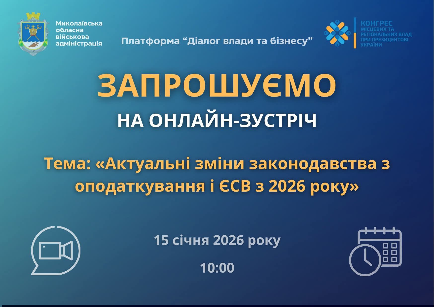 «Діалог влади та бізнесу» триває: Миколаївська обласна державна адміністрація запрошує представників бізнесу взяти участь в онлайн-зустрічі на тему: «Актуальні зміни законодавства з оподаткування і ЄСВ з 2026 року»