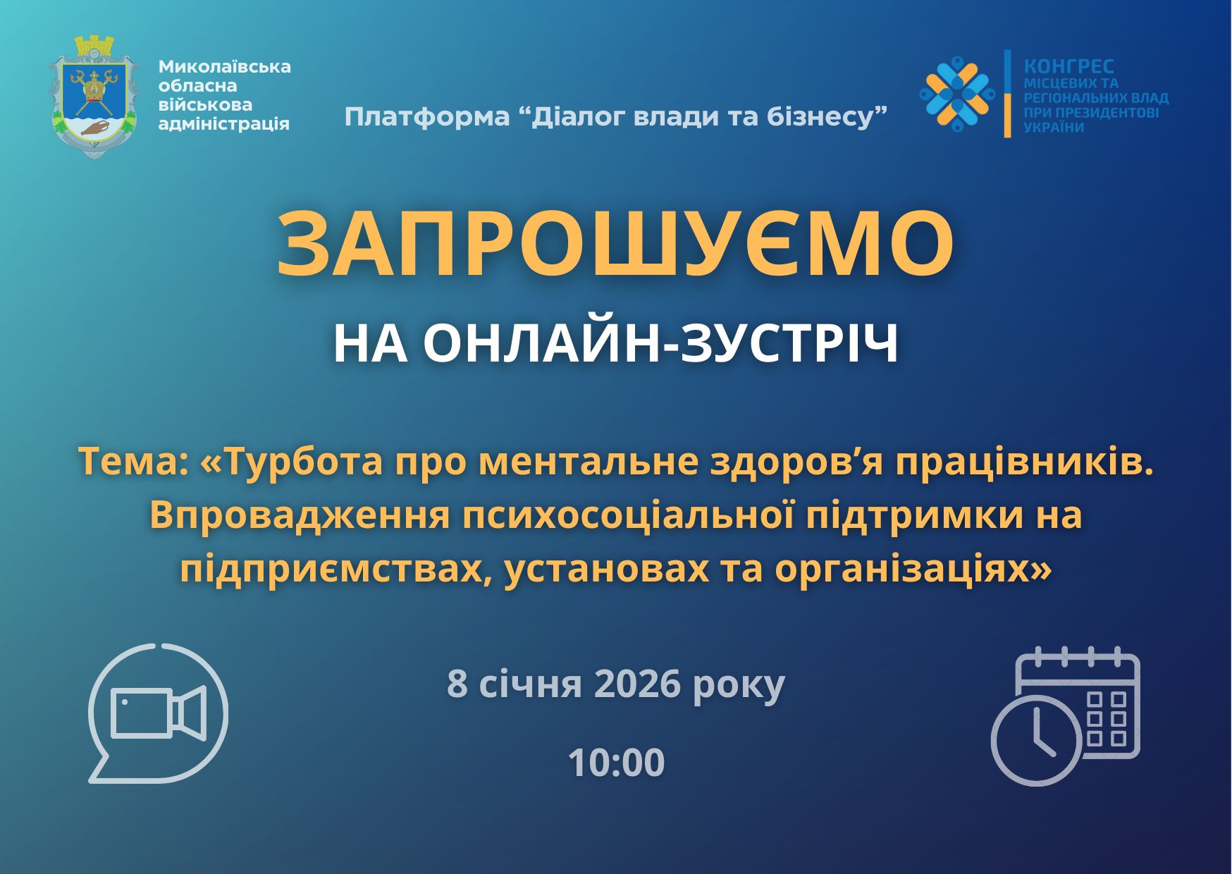 «Діалог влади та бізнесу» триває: запрошуємо представників бізнесу взяти участь в онлайн-зустрічі на тему: «Турбота про ментальне здоров’я працівників. Впровадження психосоціальної підтримки на підприємствах, установах та організаціях»
